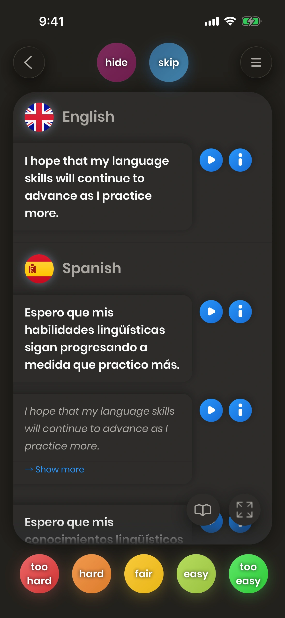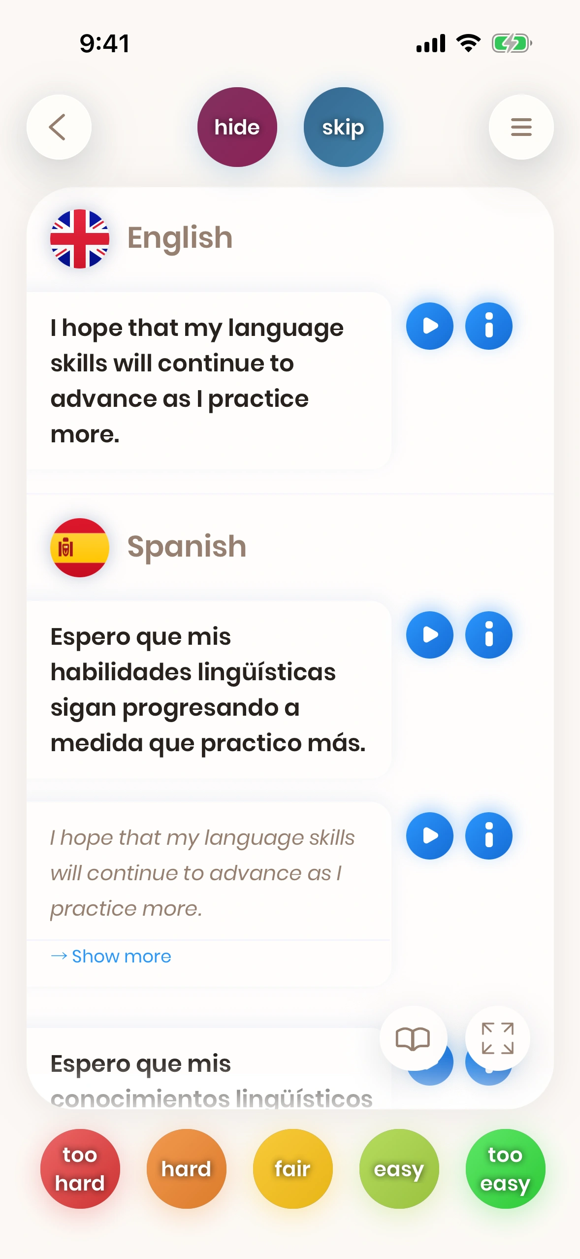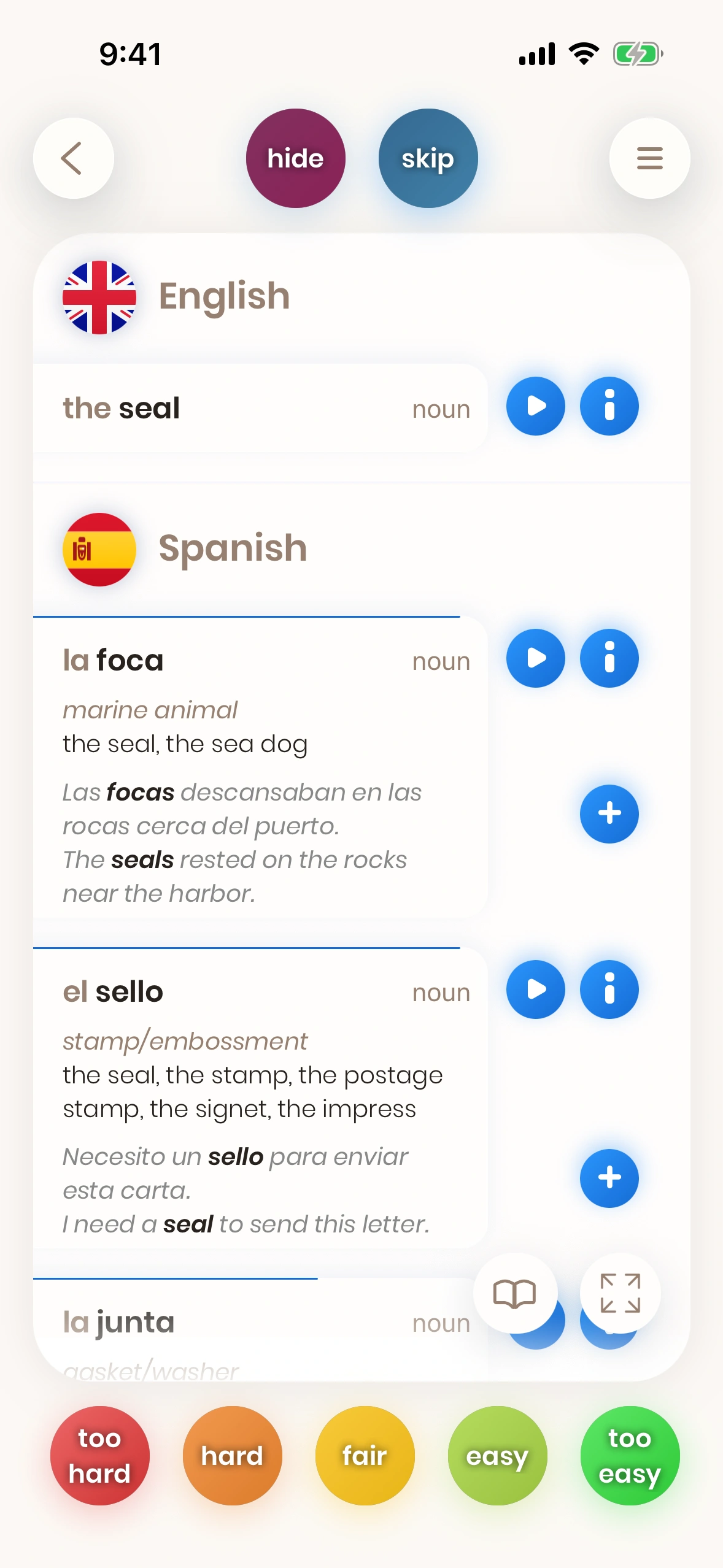 Look at a card. Try to translate the word or phrase. Turn the card. Tell us how difficult it was. Difficult words and phrases are shown again soon.