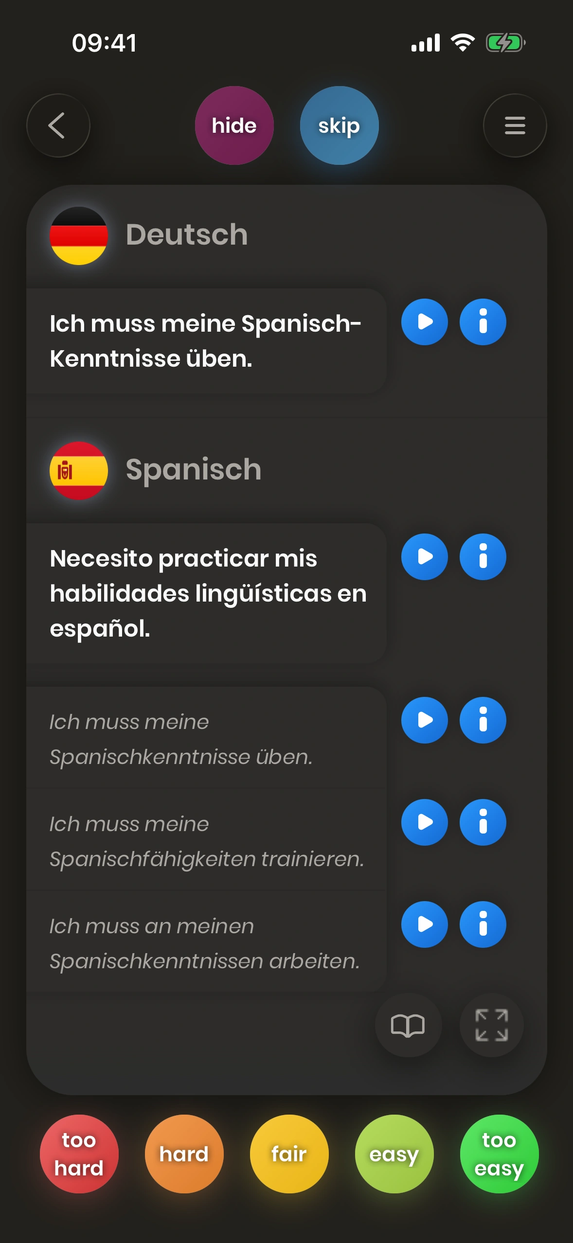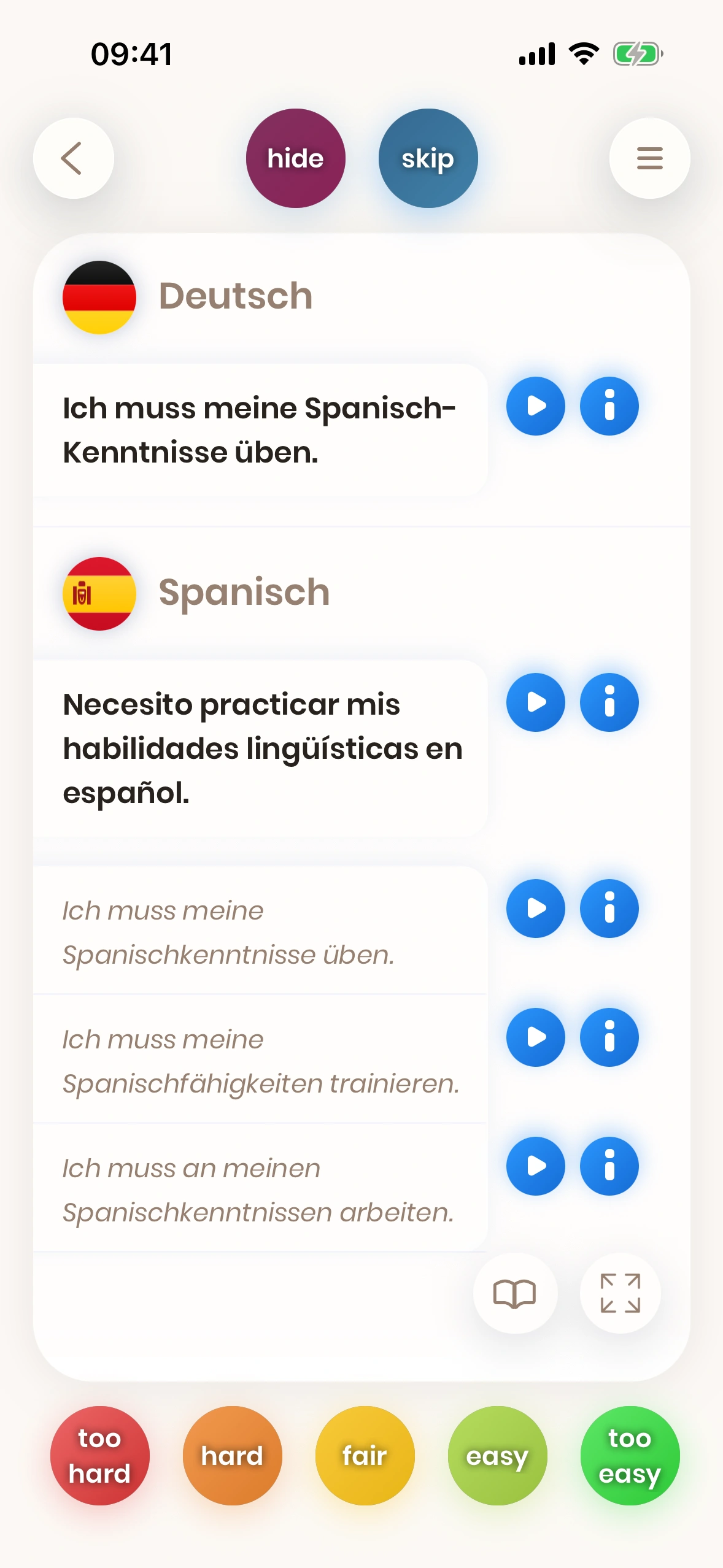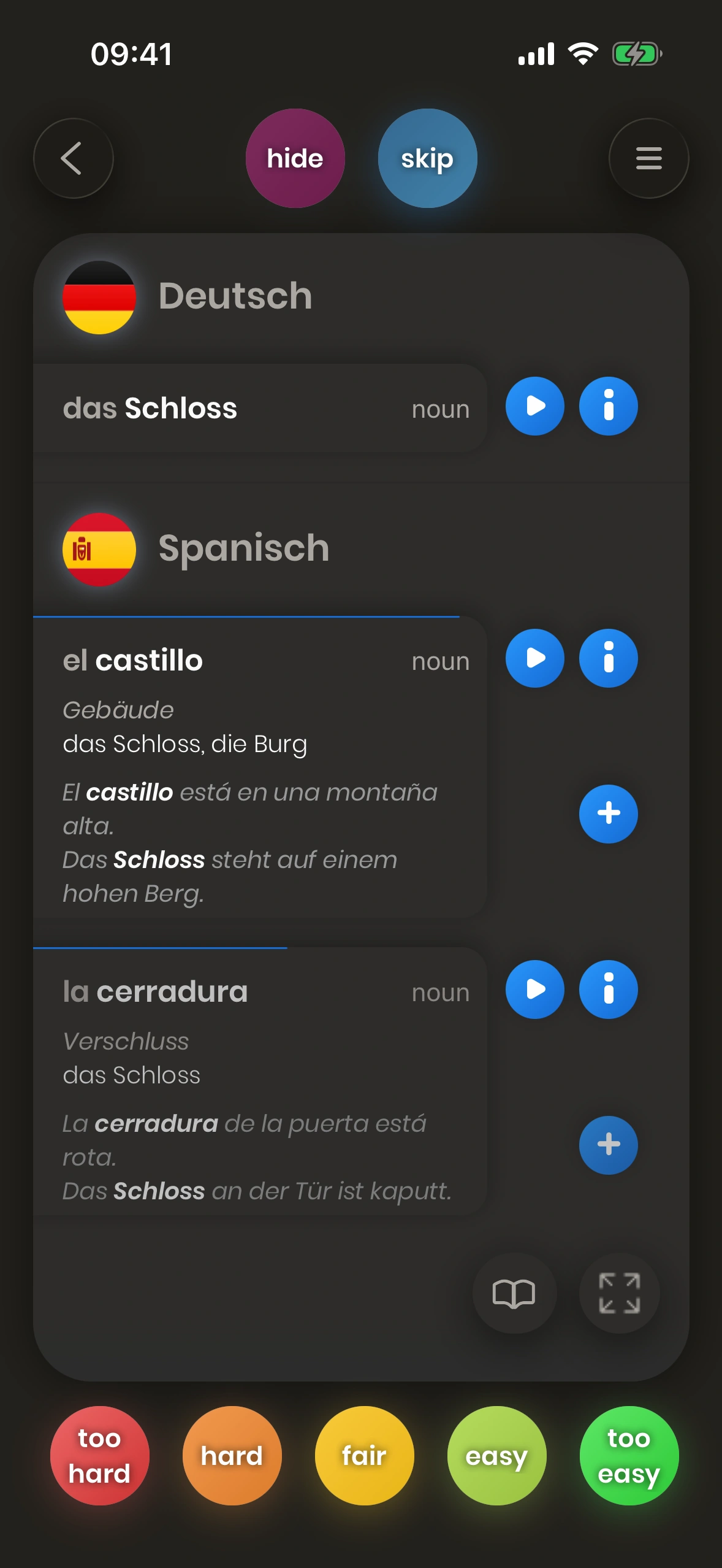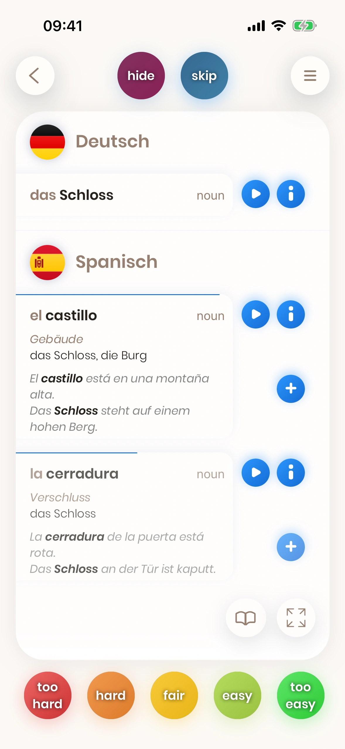 Schau dir eine Karte an. Versuche, das Wort oder die Phrase zu übersetzen. Dreh die Karte um. Sag uns, wie schwierig es war. Schwierige Wörter und Phrasen werden bald wieder gezeigt.