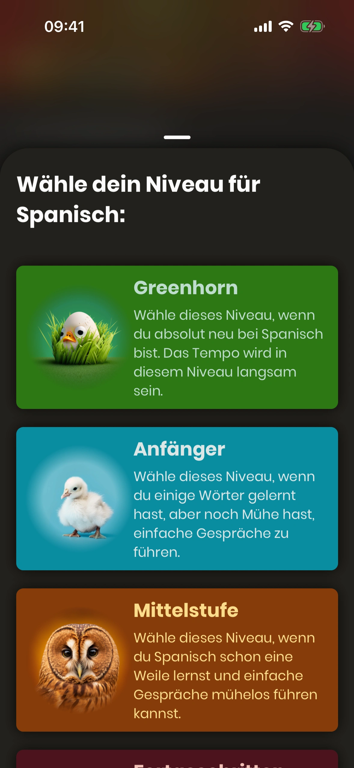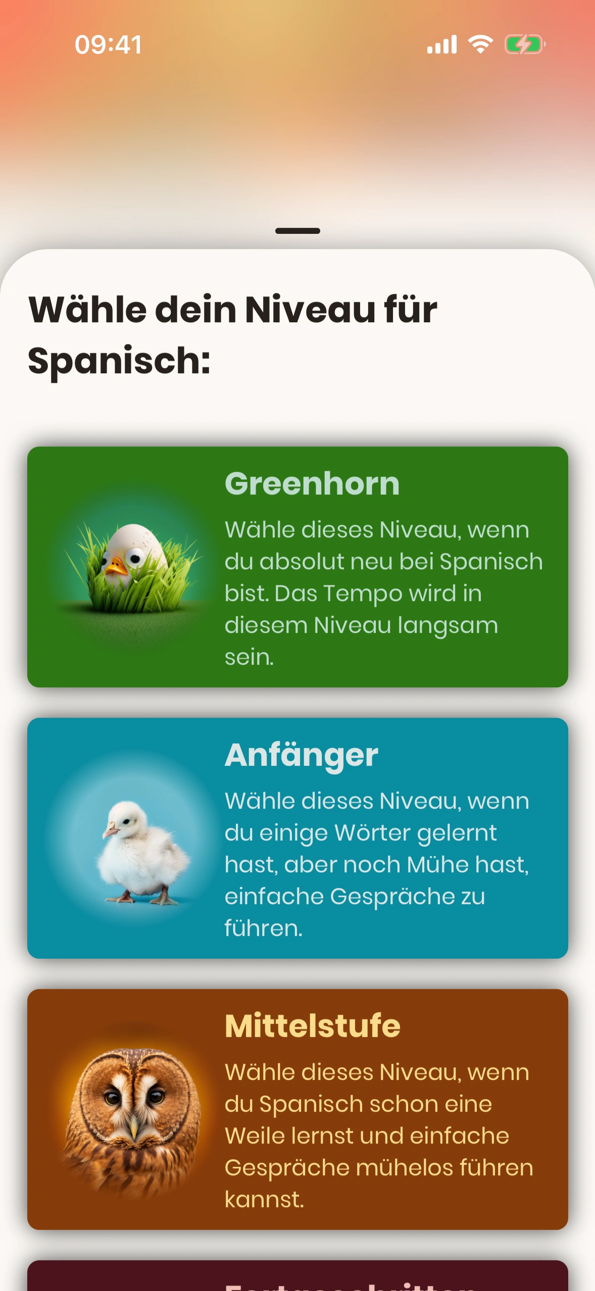 Im Tutorial beim ersten Start schätzt Just Spanish deine Fähigkeiten ein und schlägt dir ein Niveau vor. Wir empfehlen, den Vorschlag zu übernehmen – du kannst ihn aber jederzeit ändern.