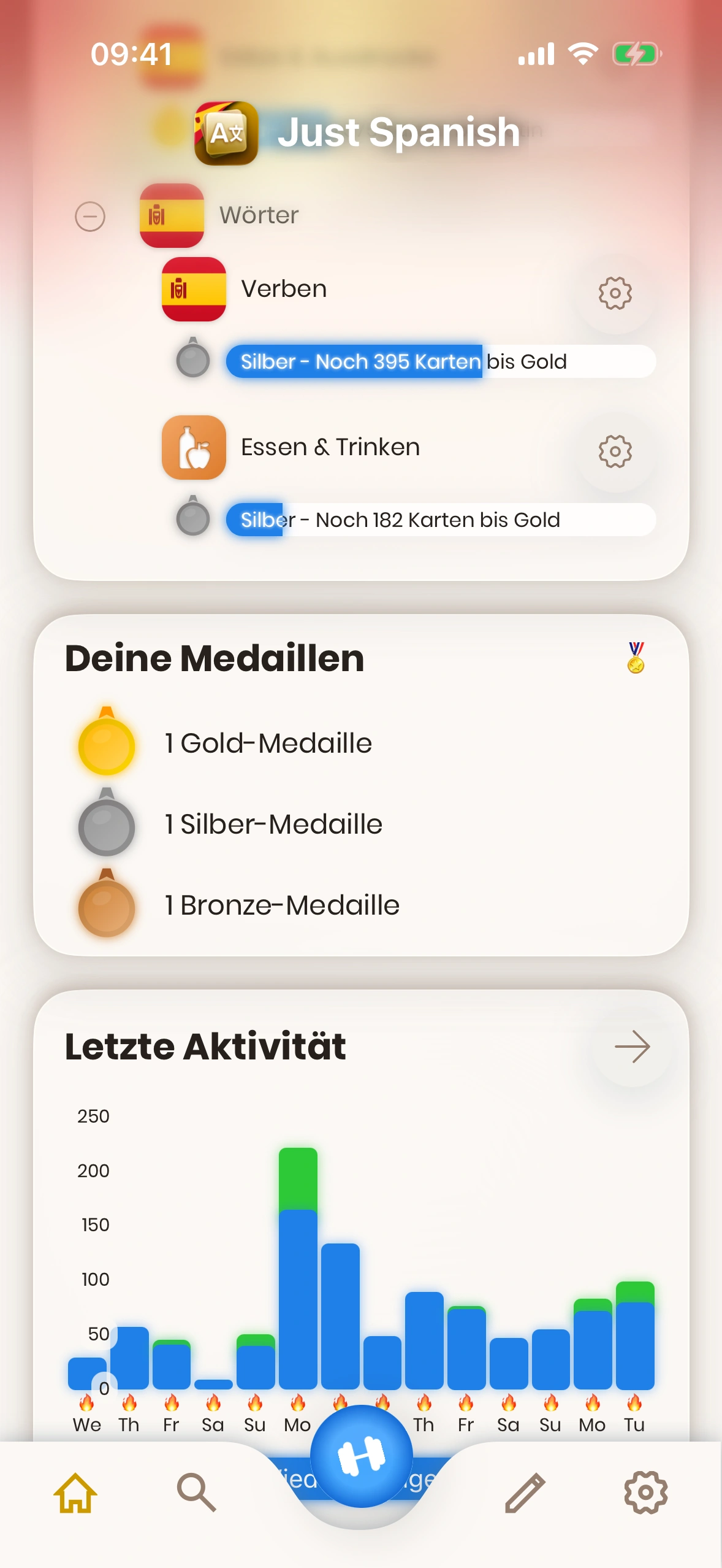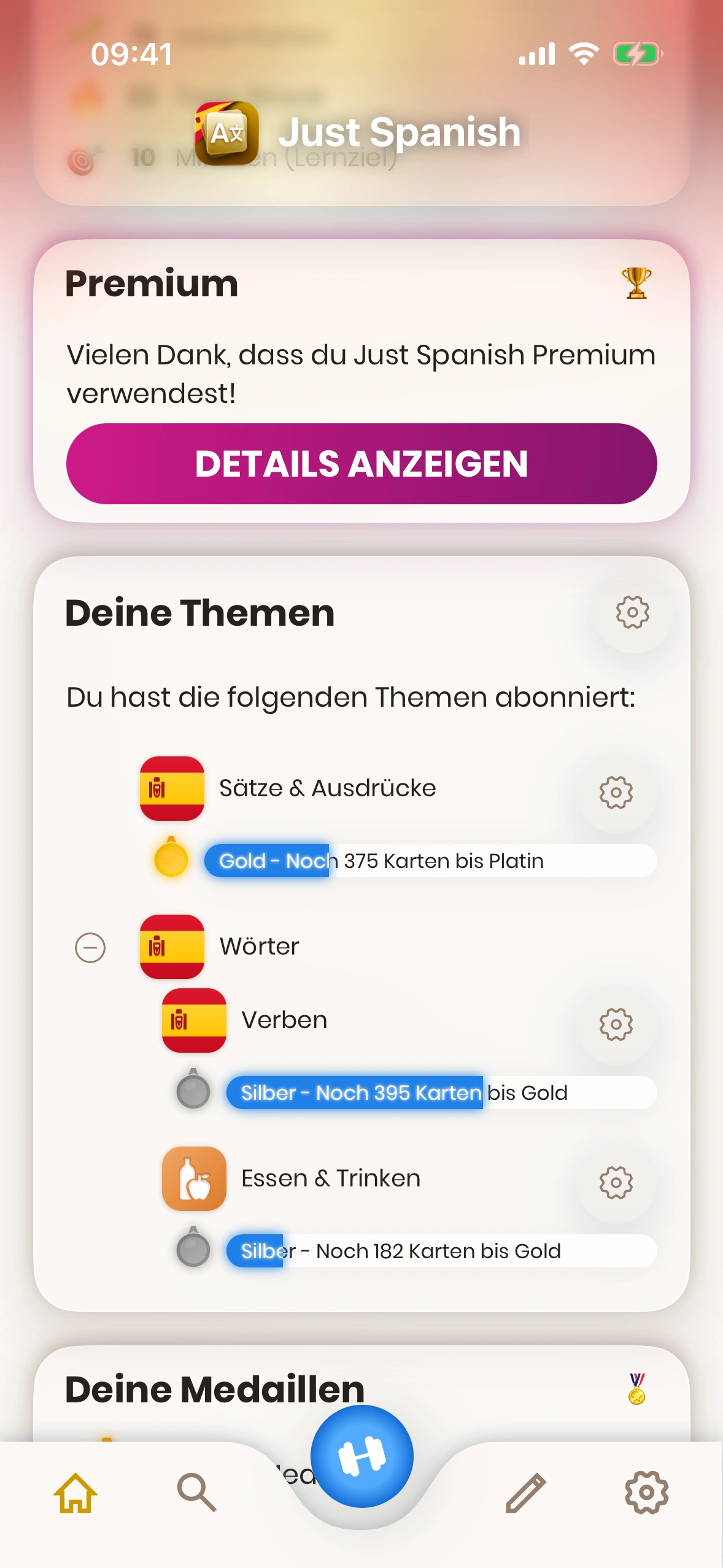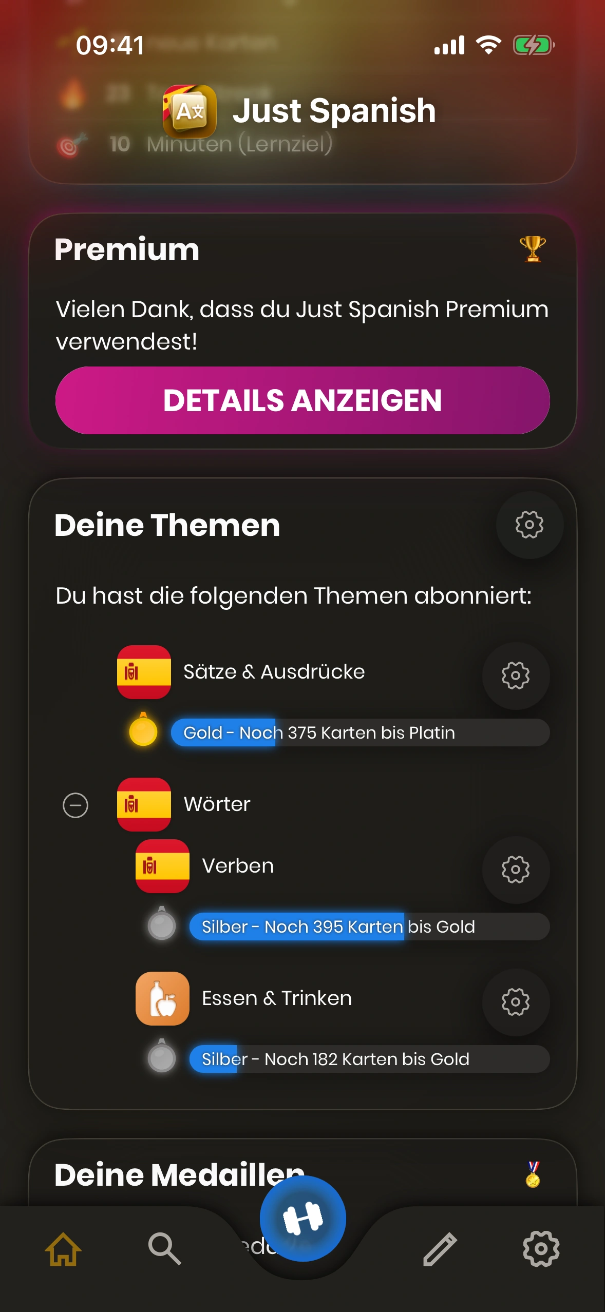 - Tägliches Lernziel: Hier siehst und änderst du dein tägliches Lernziel. Tippe auf den Stift, um es zu ändern.