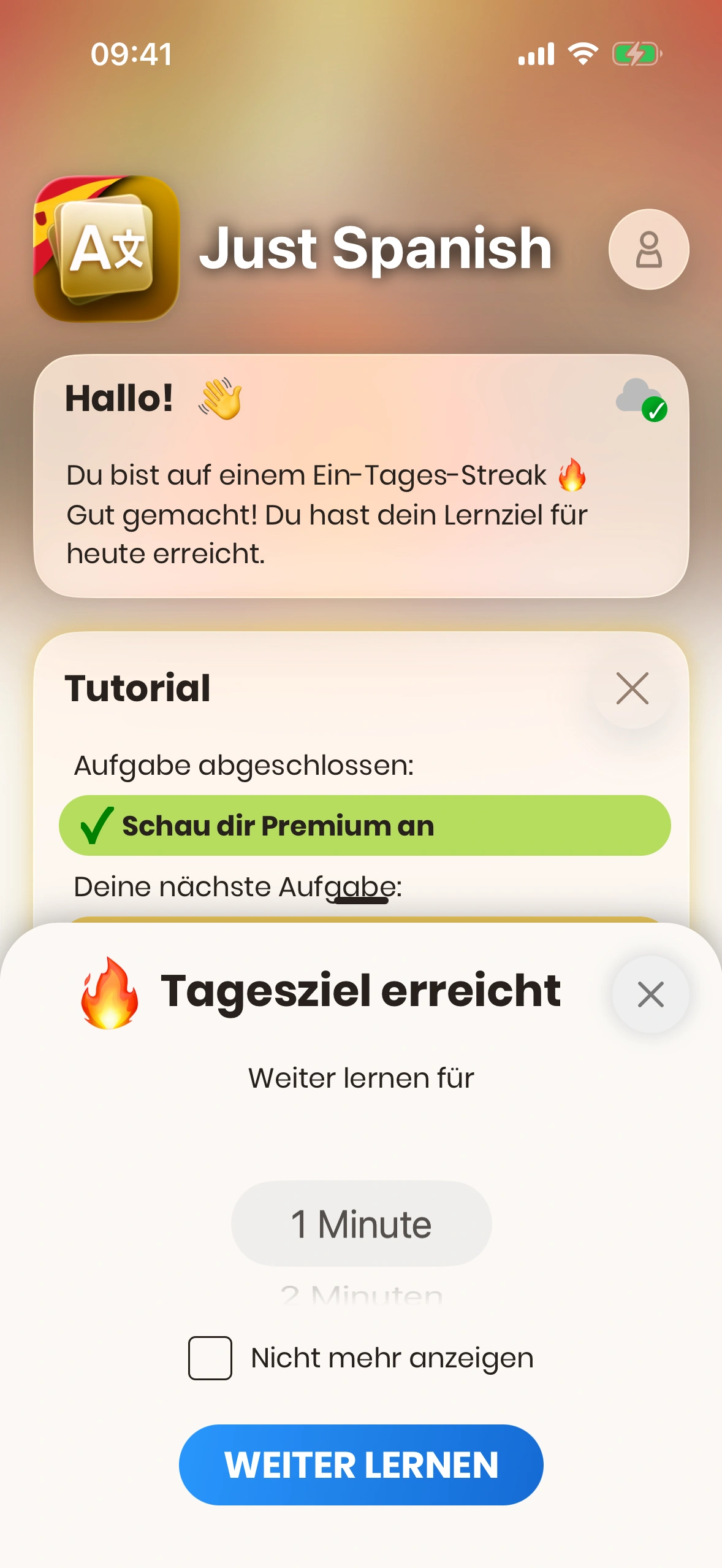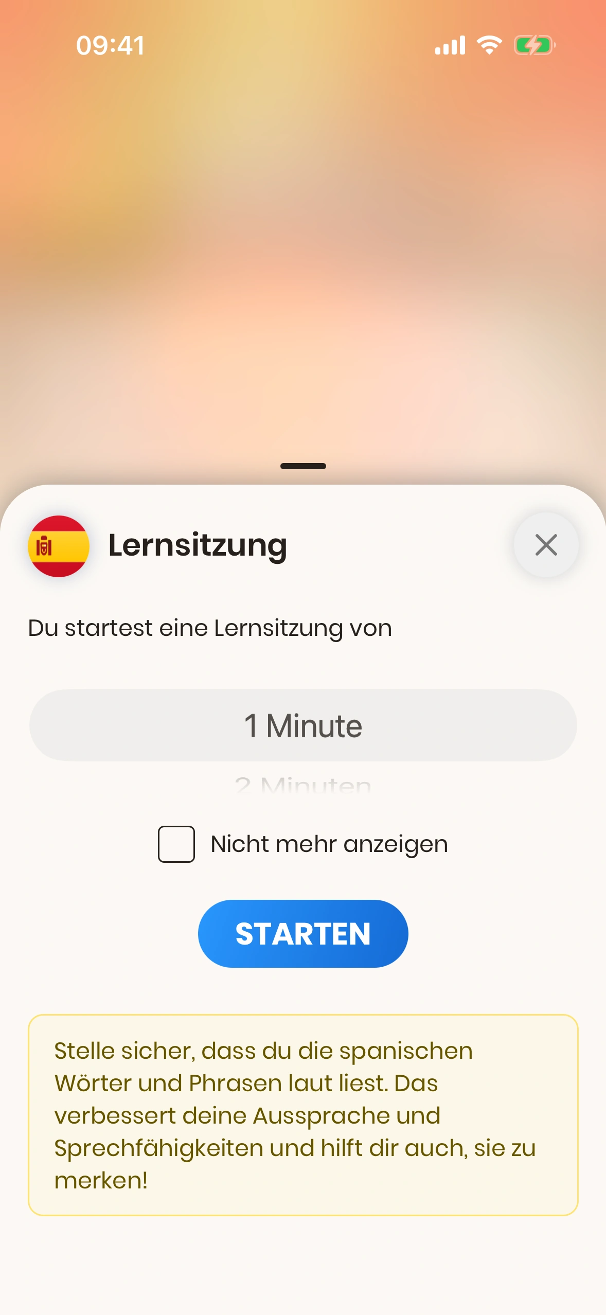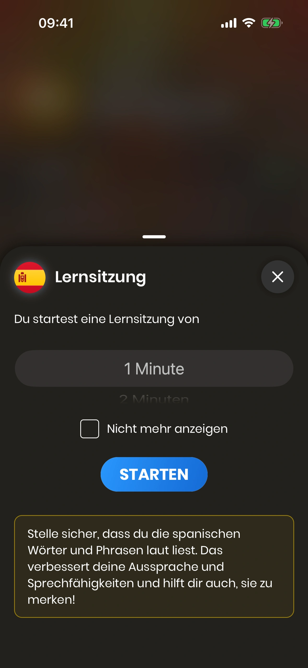 Dieses Bottom Sheet kann in den Einstellungen deaktiviert werden. Wenn es deaktiviert ist, startet die Lernsession sofort mit der Standarddauer.