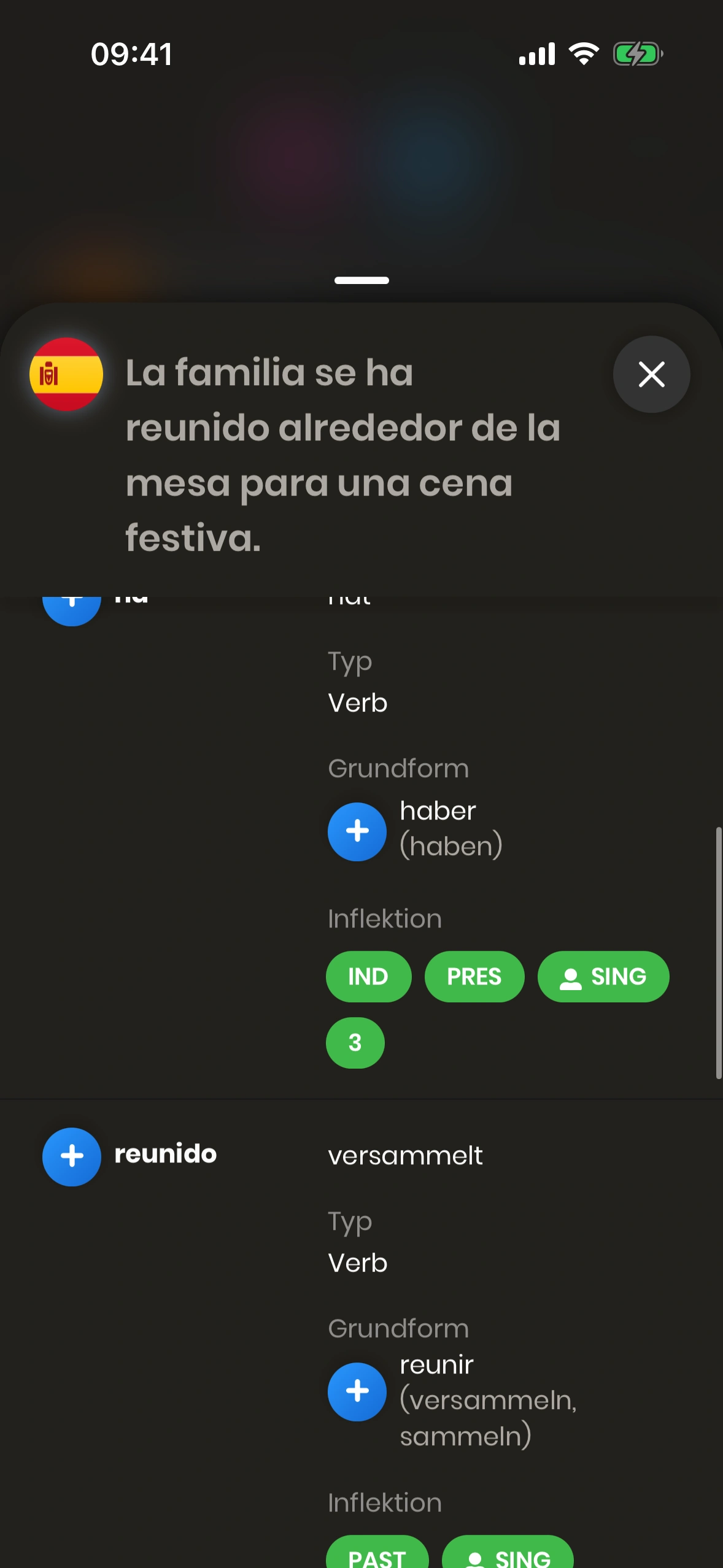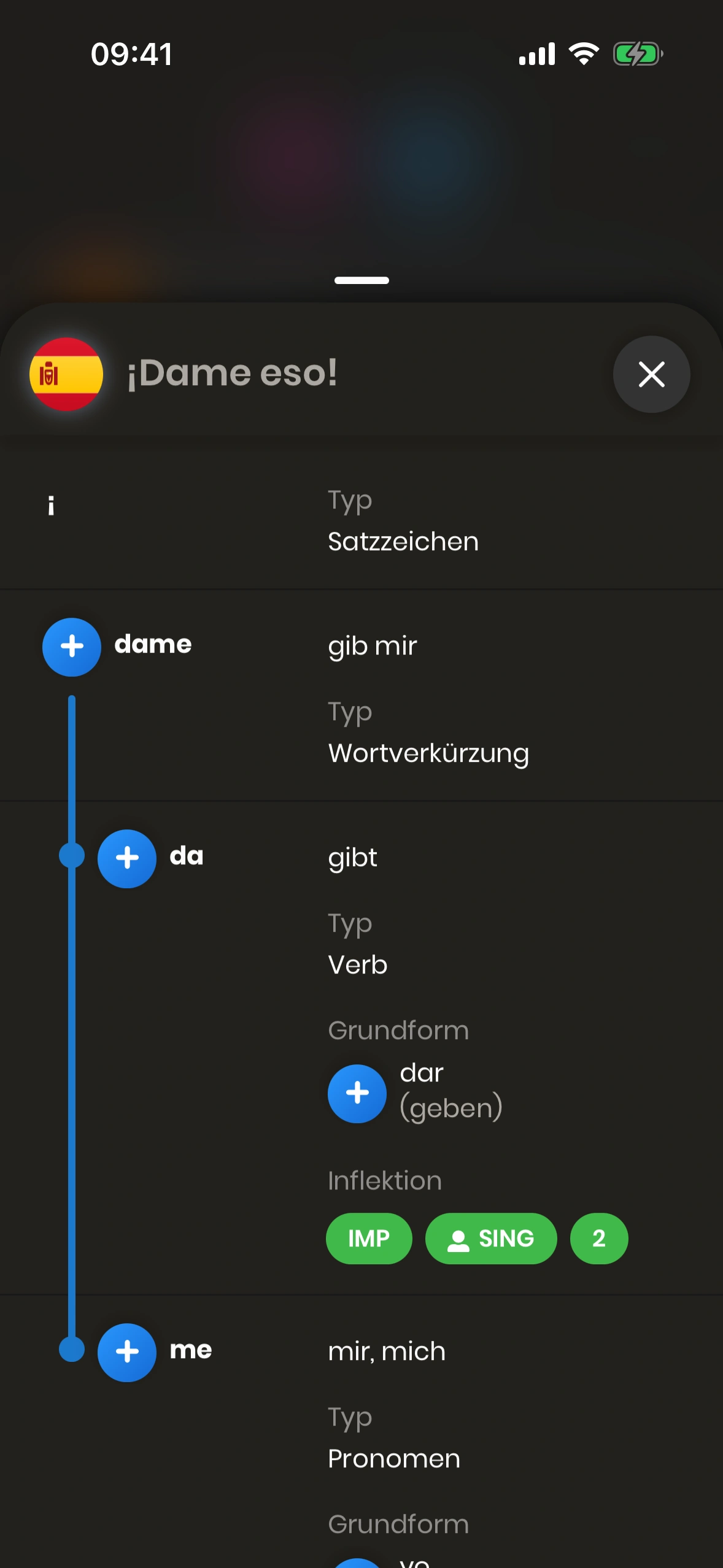 Der Satzstruktur‑Dialog erscheint, wenn du bei einer Satzkarte auf das (i) tippst – neben dem Satz in der Zielsprache.