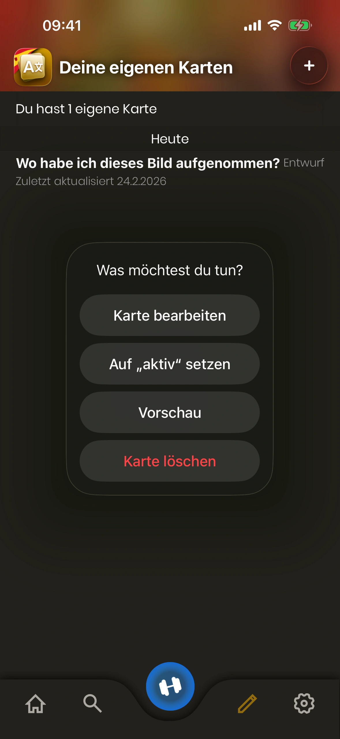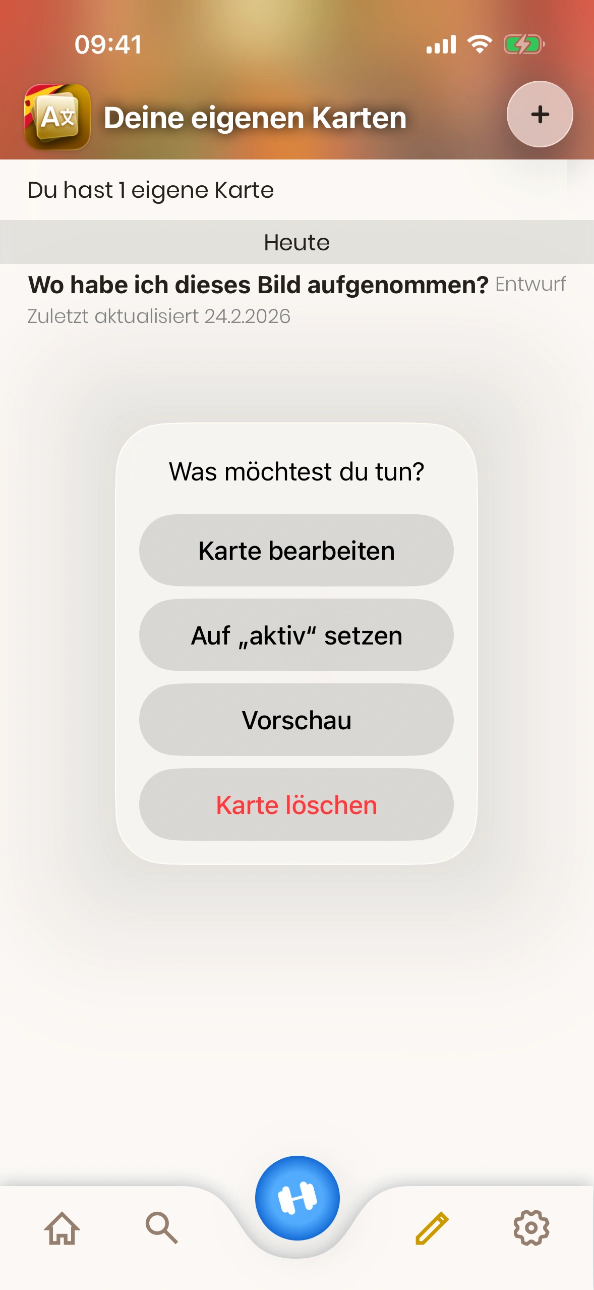 - Kartenstatus: Eine Eigene Karte ist entweder „Entwurf“ oder „Aktiv“. Entwürfe werden beim Lernen nicht gezeigt. Tippe die Karte, um den Status zu ändern.