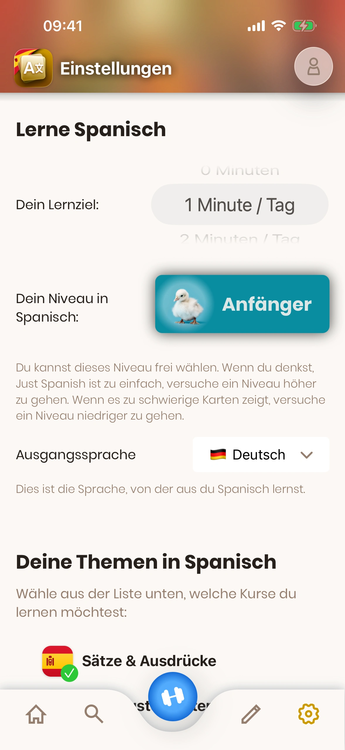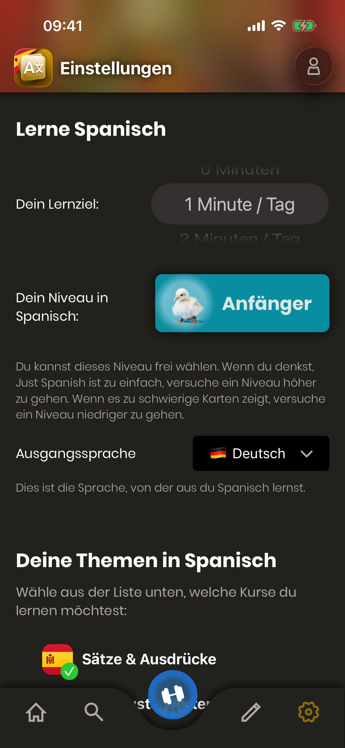 Die Minuten pro Tag sind der wichtigste Faktor für schnellen Fortschritt. Klar: Je mehr du lernst, desto schneller kommst du voran. Das Tagesziel stellst du in den Einstellungen ein.