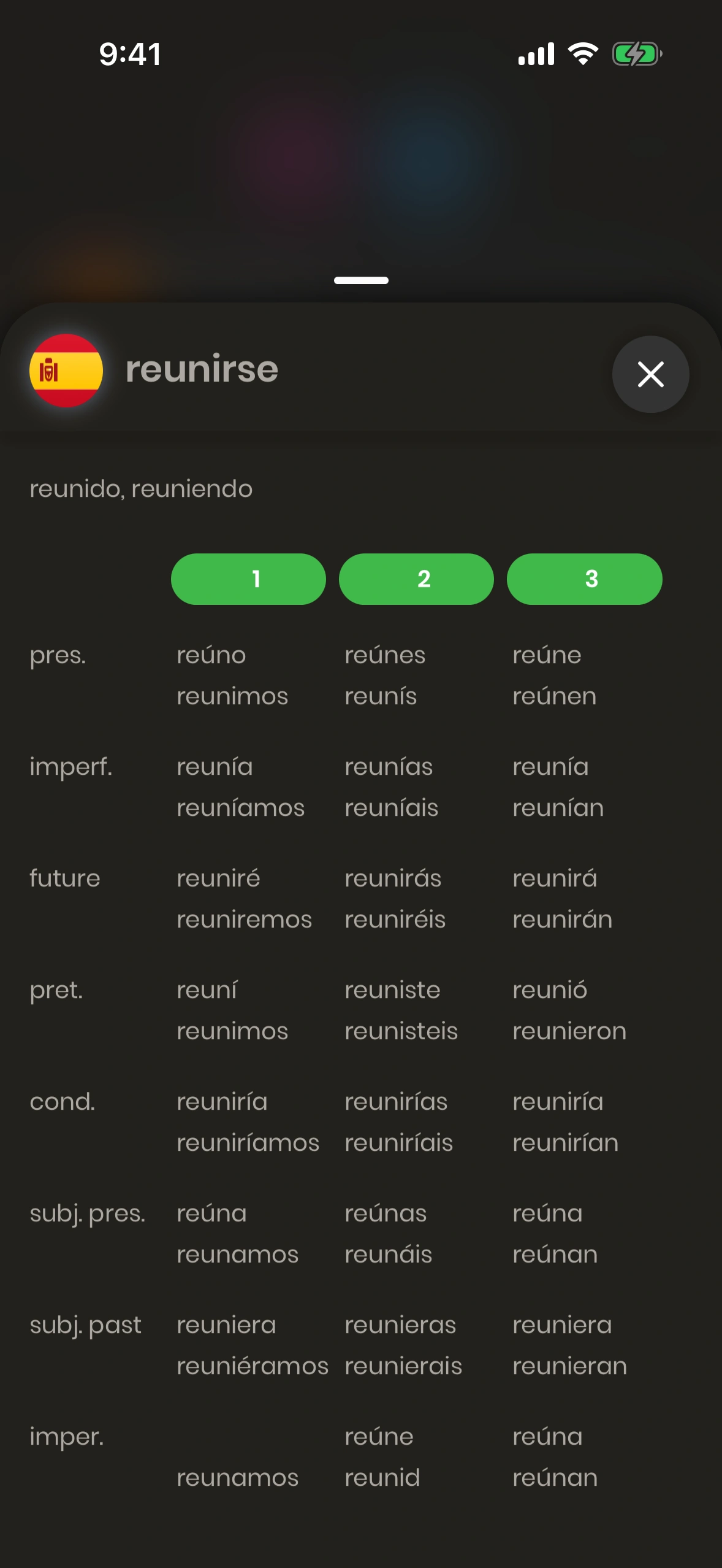 The Conjugation Modal shows a verb conjugation table. It can be shown for all Spanish verbs. To view it, tap the (+) button beside any Spanish verb.
