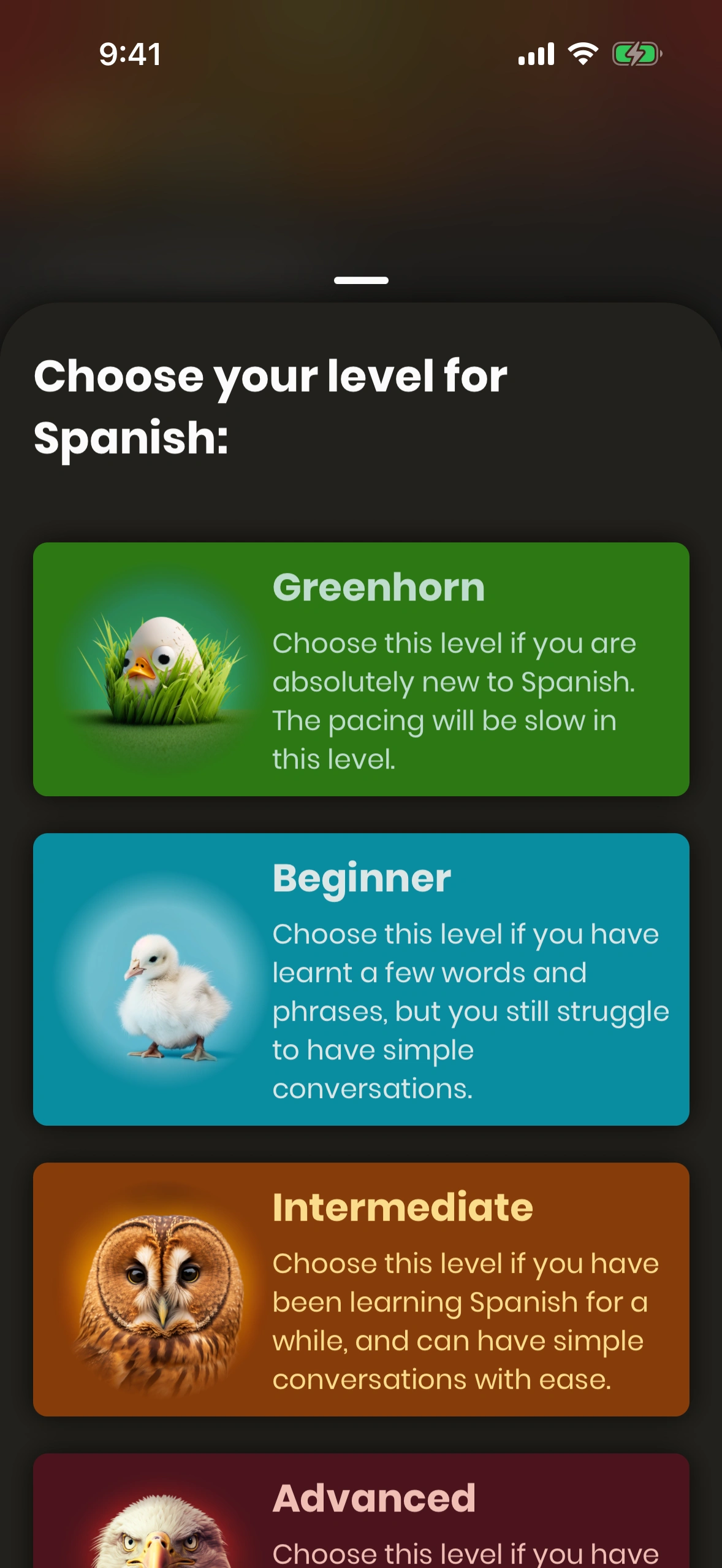 - Advanced users have a solid vocabulary and a good understanding of the principles of the language. They are shown more complex phrases, which lets them practice the language at their level.