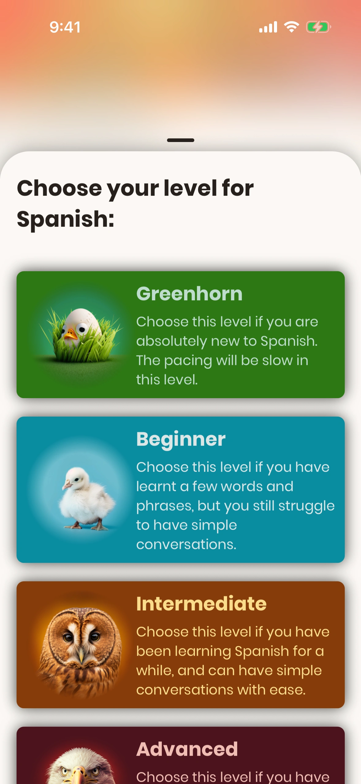 In the tutorial you do at the first startup of the app, Just Spanish estimates your language ability and proposes a level for you. We recommend you to accept this level, but you can change it at any time.
