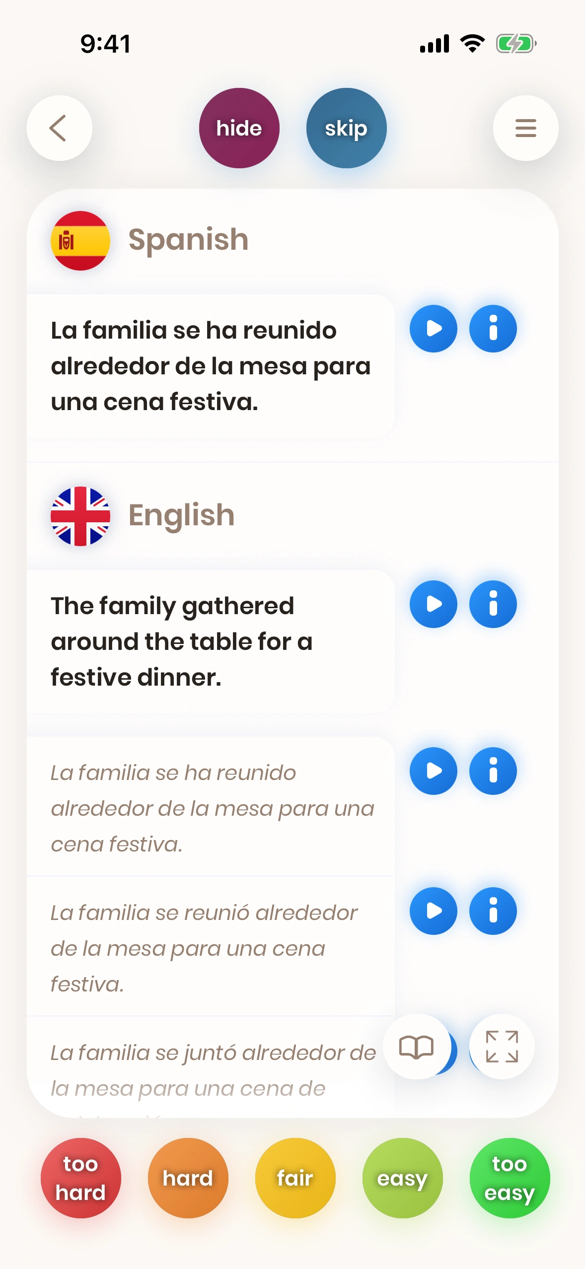 Like Word cards, Sentence cards too have their direction. Either you translate English-to-Spanish or Spanish-to-English. For most Sentence cards, there is an equivalent card in the other direction.