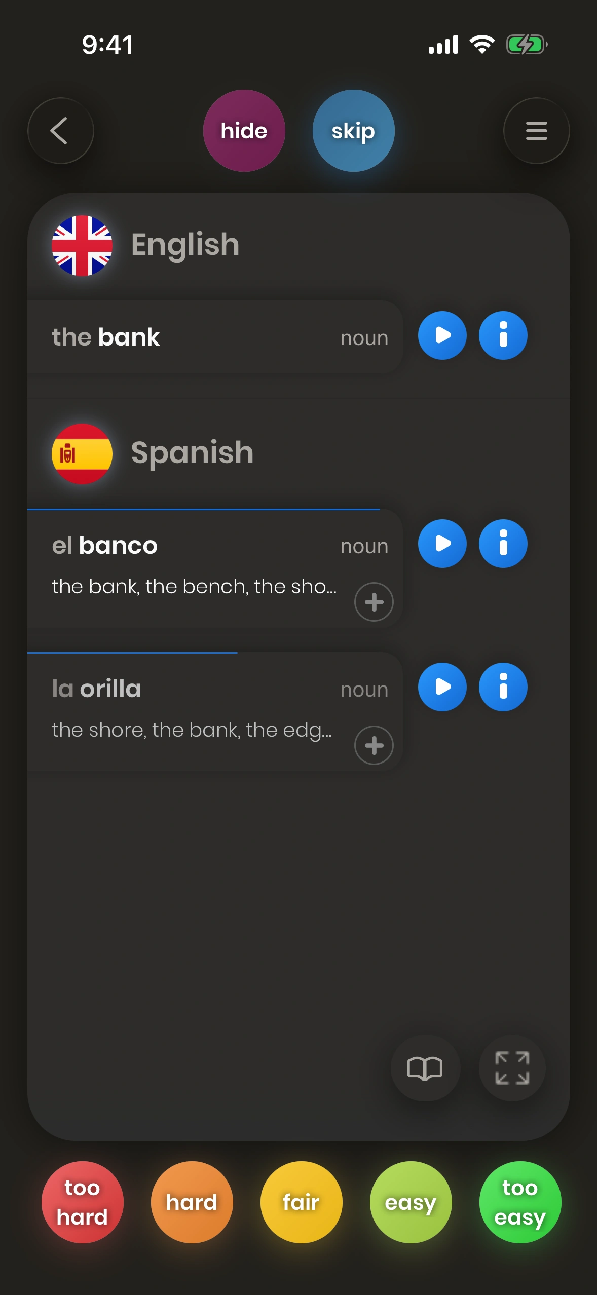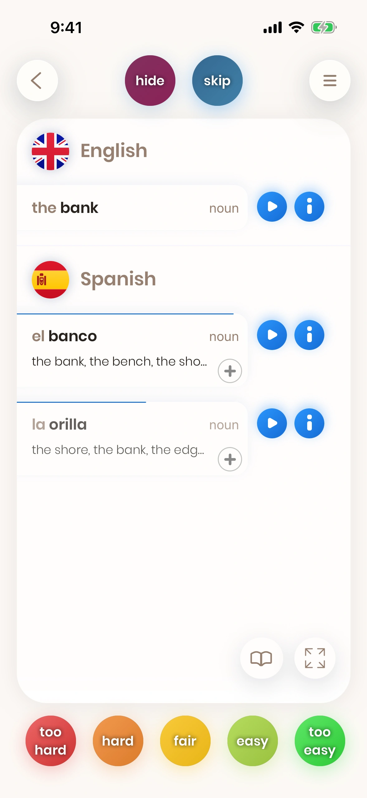 These cards train your passive vocabulary. You learn to understand Spanish words, but you might not yet use them actively.