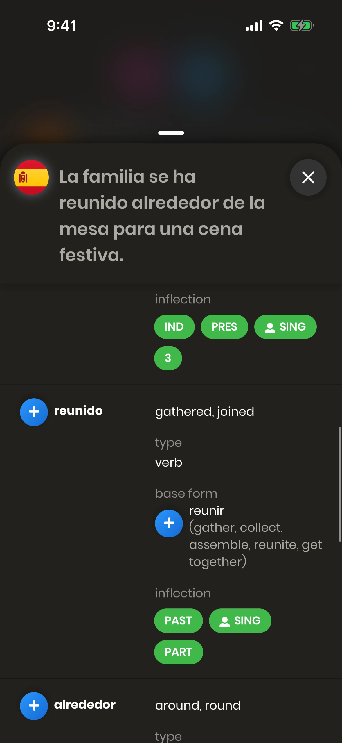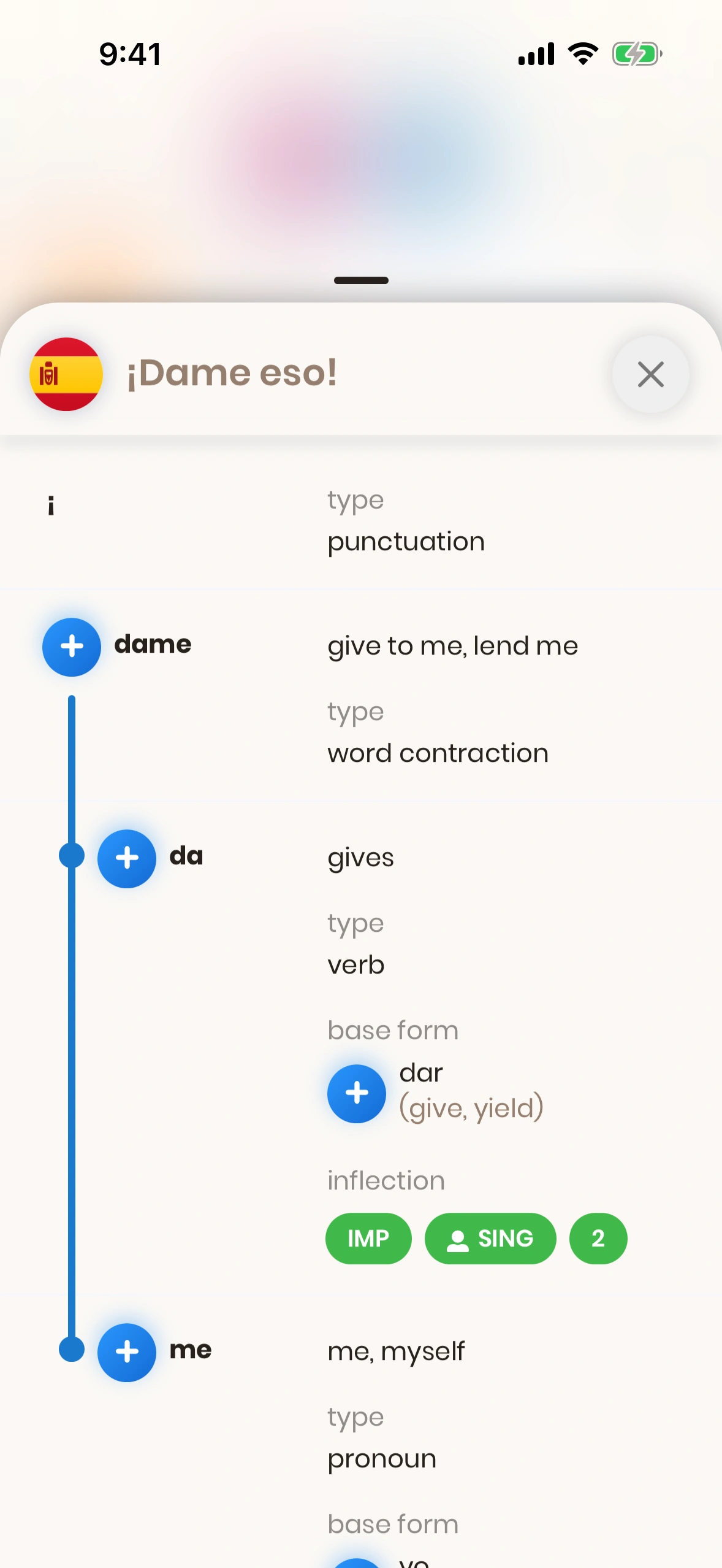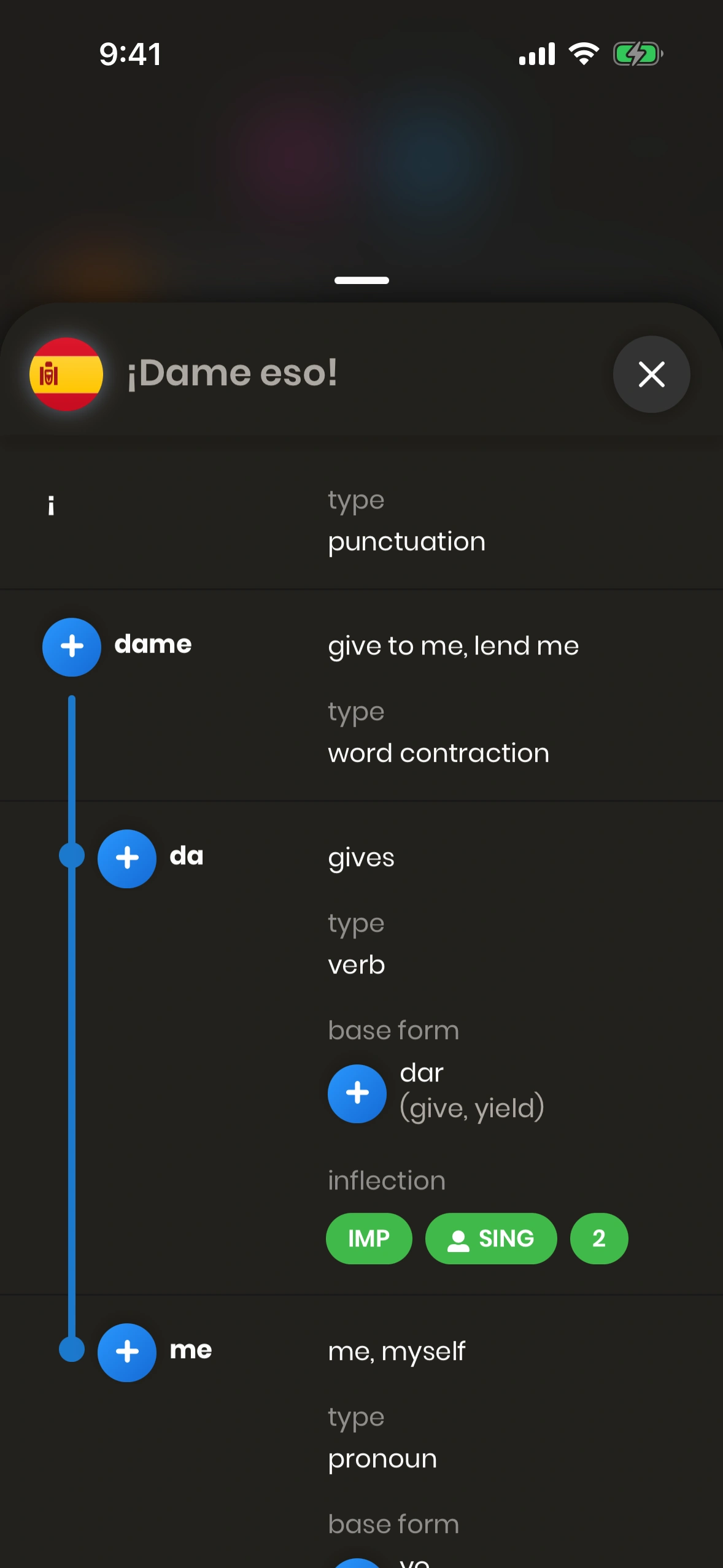 The Sentence Structure Modal will be shown if you press the (i) button on a sentence card, next to a sentence in Spanish.