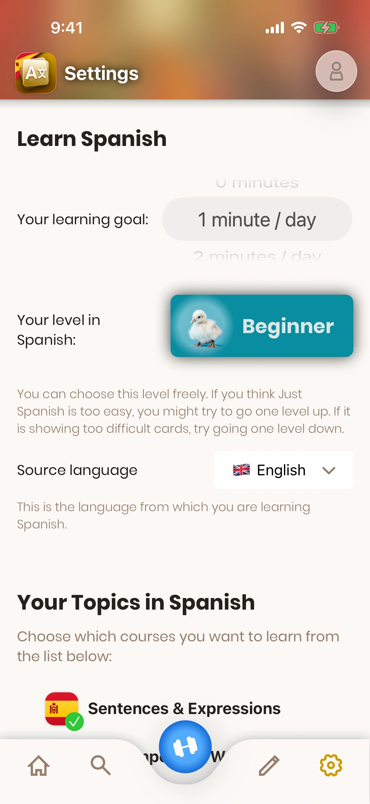 If you feel like Just Spanish is showing you cards that are too easy (or too repetitive) or too difficult, then it might make sense to change the language level.