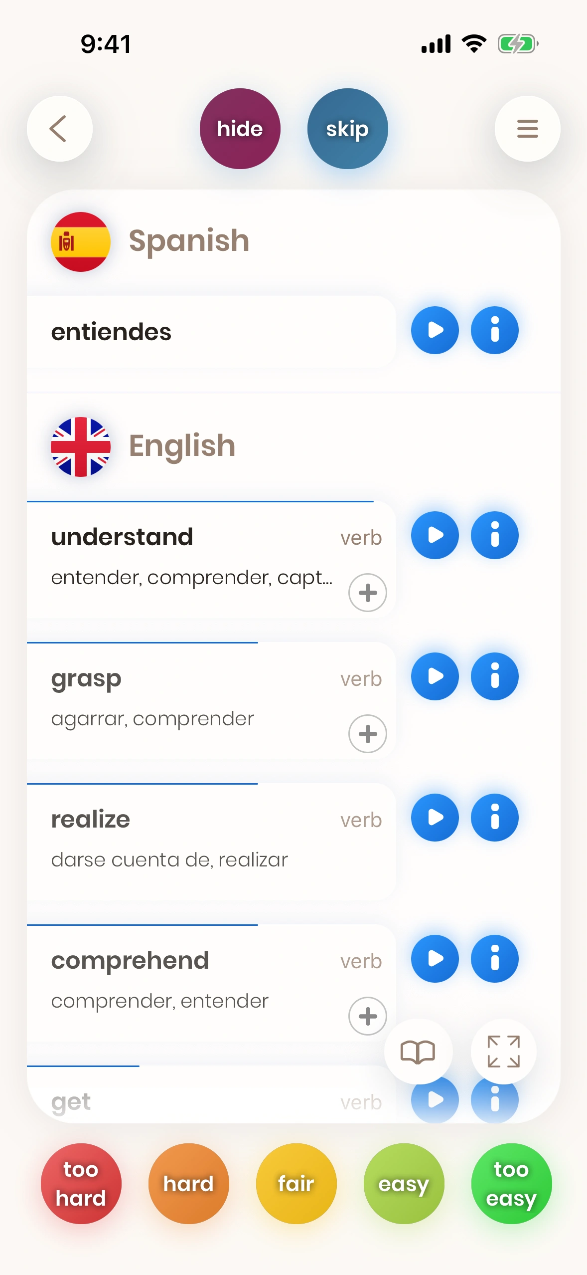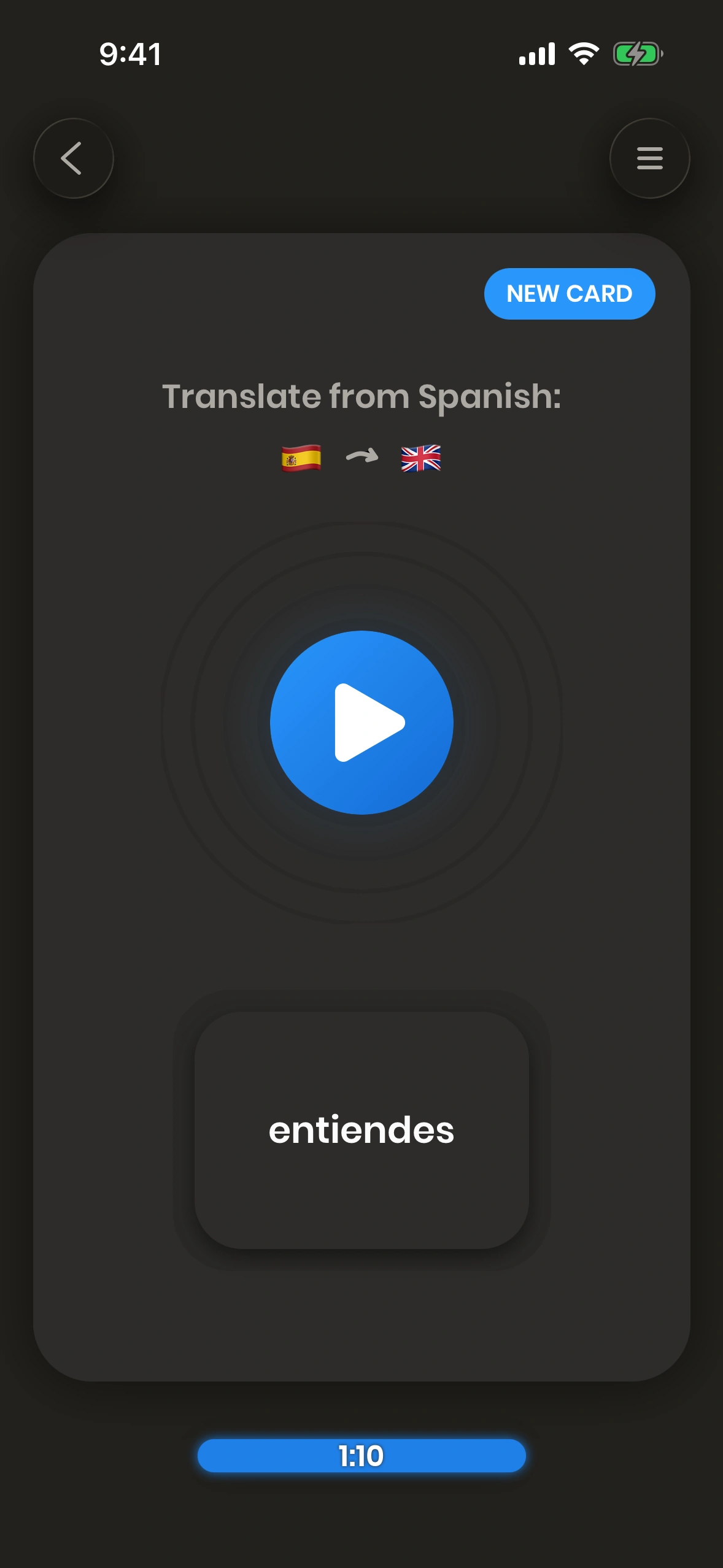 Just Spanish is a flashcards-based app. Flashcards are cards which have both a front and a back side. You look at the front side and try to translate the word (or phrase) on it.