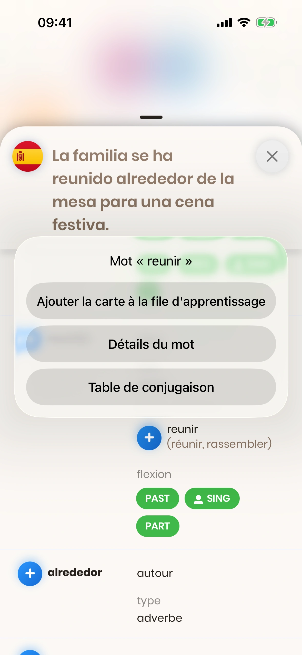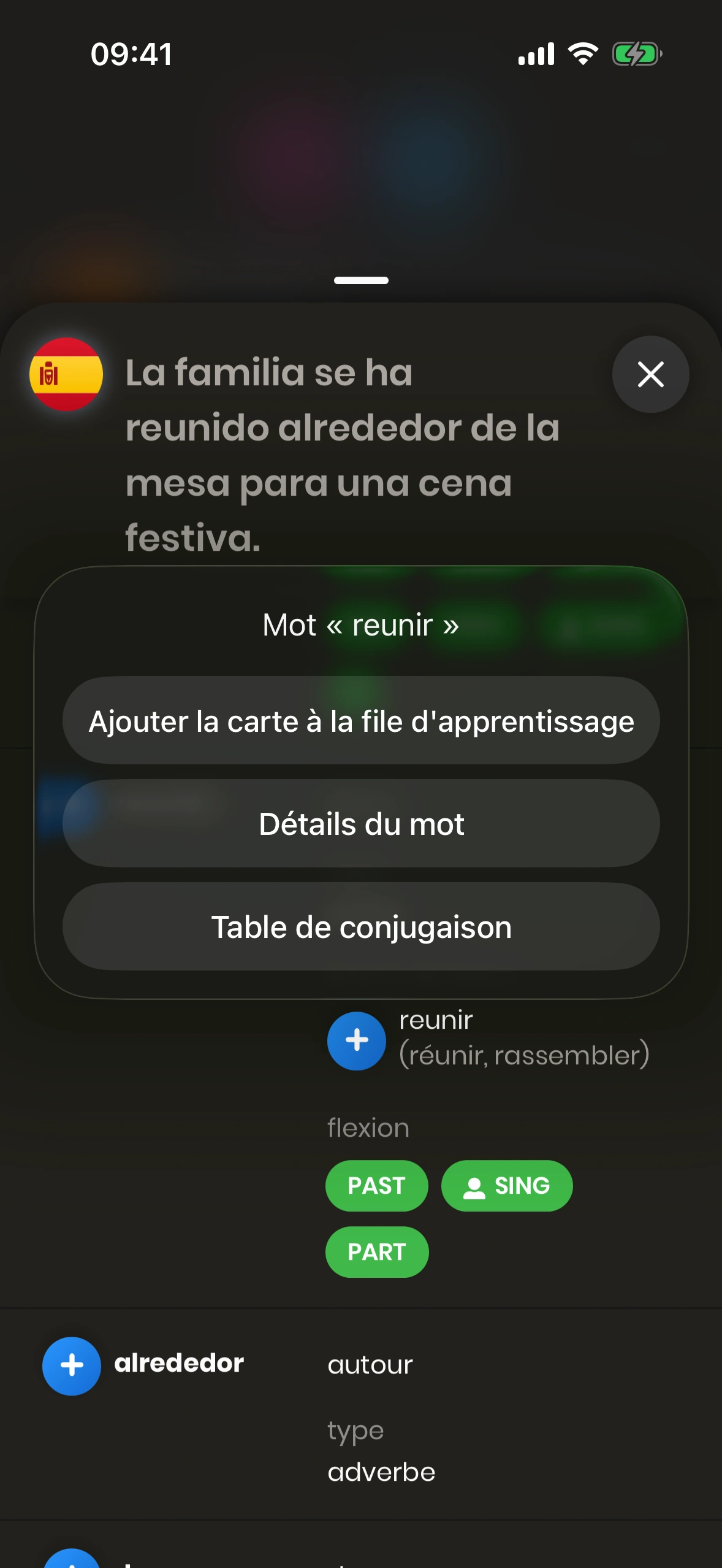 - Ajouter la carte à la file d'apprentissage : Ajoute le mot sélectionné comme carte séparée à ta file d'apprentissage.
