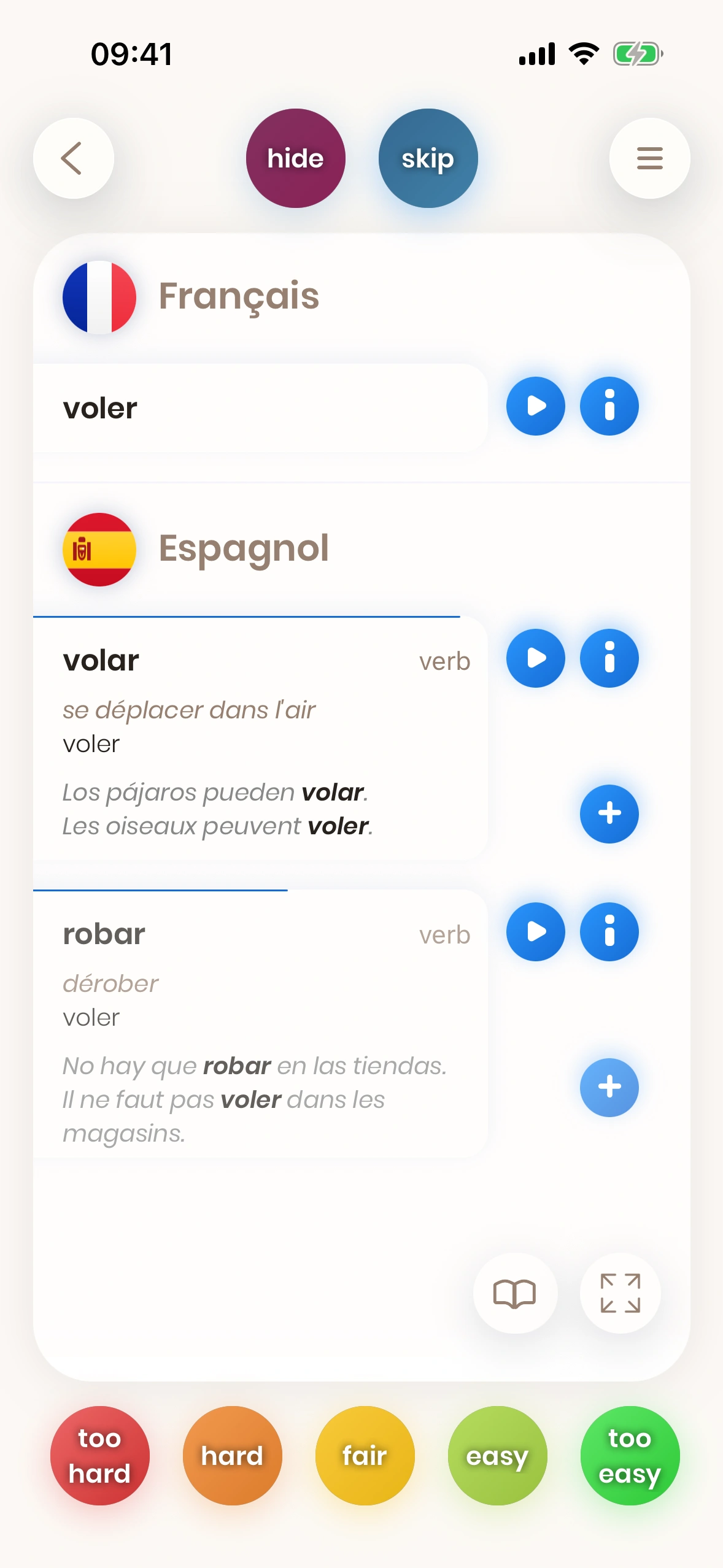 Quand tu pratiques un mot dans différents contextes (comme mot seul et dans des exemples de phrases), tu as de grandes chances de ne plus jamais oublier sa traduction.