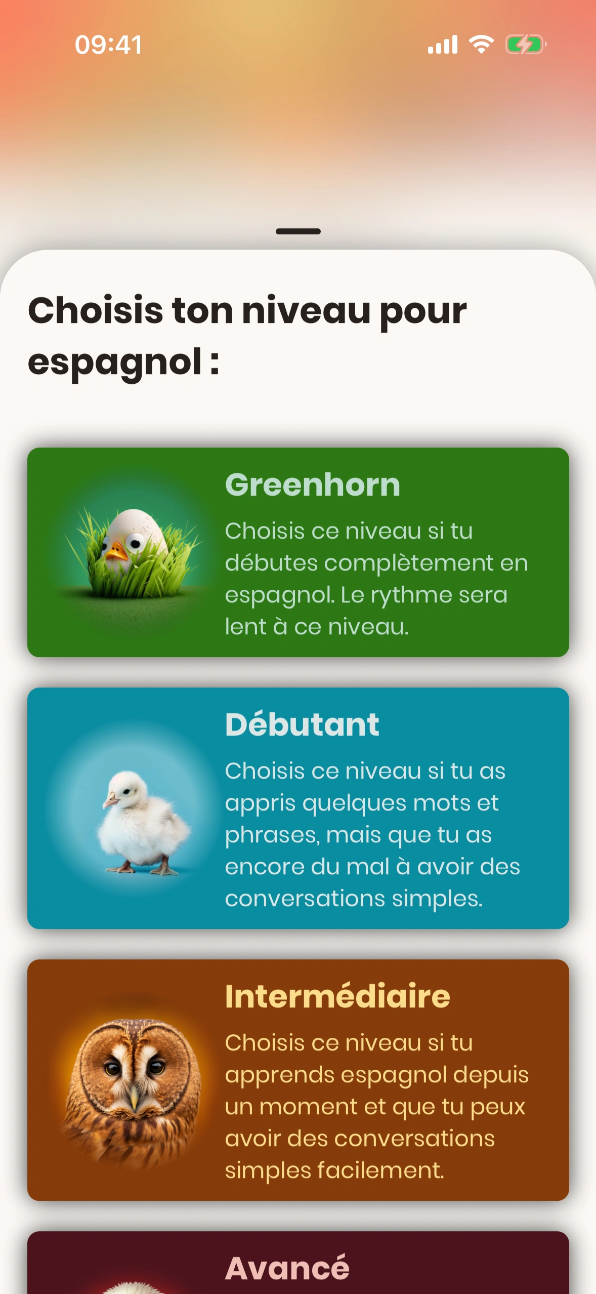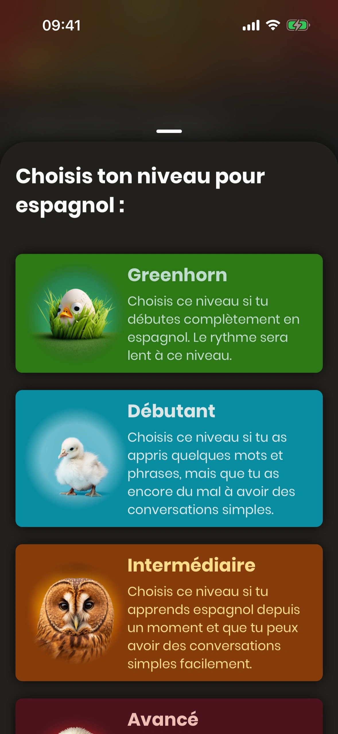 Dans le tutoriel au premier démarrage, Just Spanish évalue tes compétences et te propose un niveau. Nous recommandons d'accepter la suggestion – mais tu peux la modifier à tout moment.