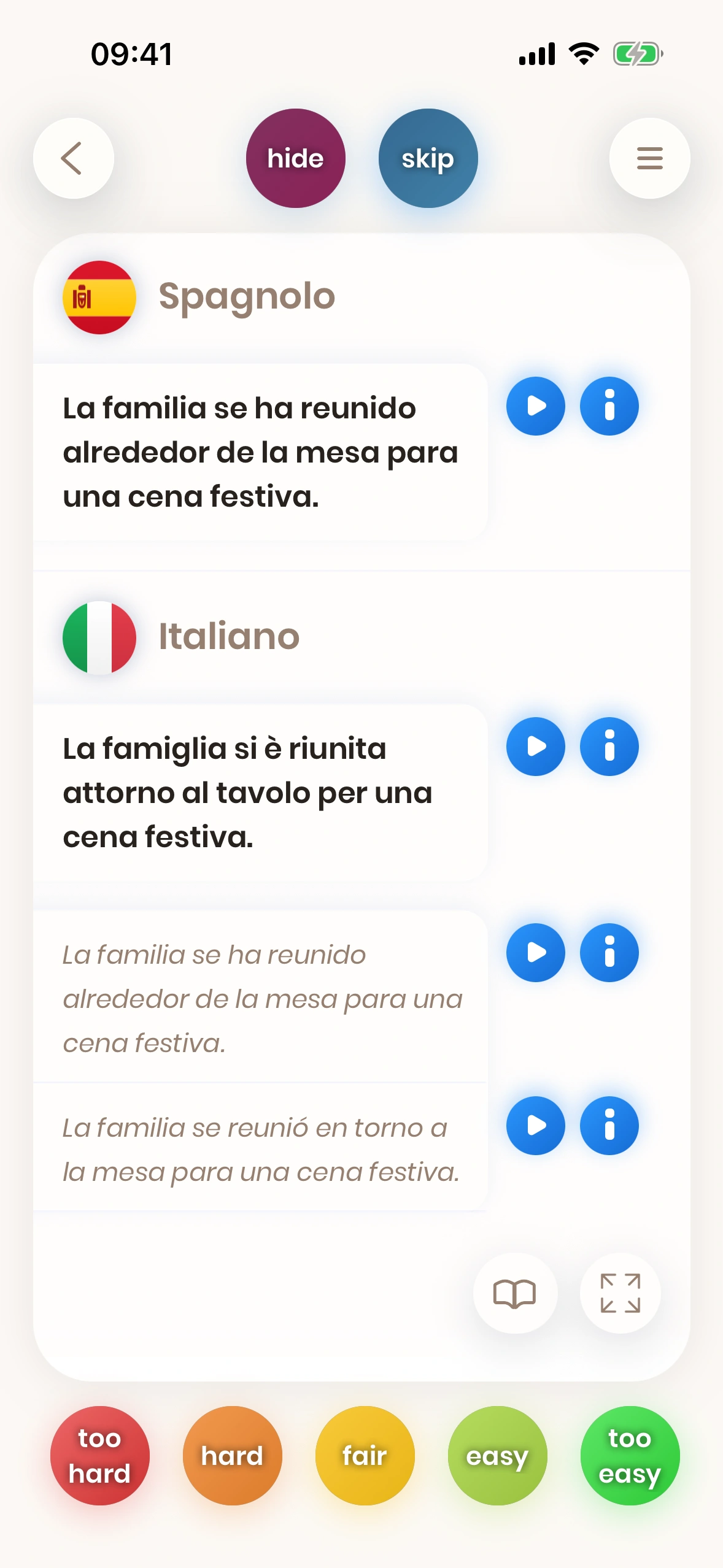 Just Spanish ti proporrà carte in entrambe le direzioni. Ti eserciterai sia 🇮🇹 → 🇪🇸 che 🇪🇸 → 🇮🇹.