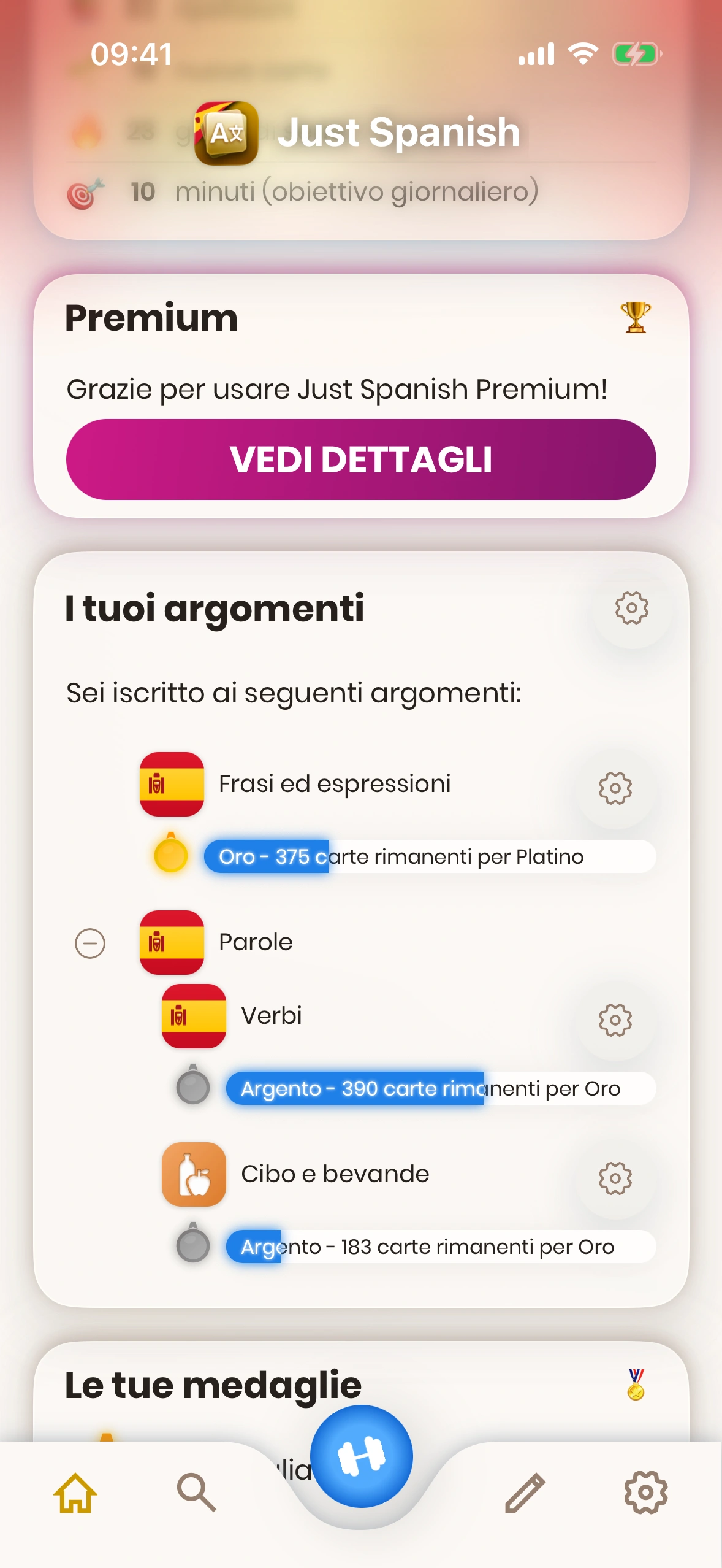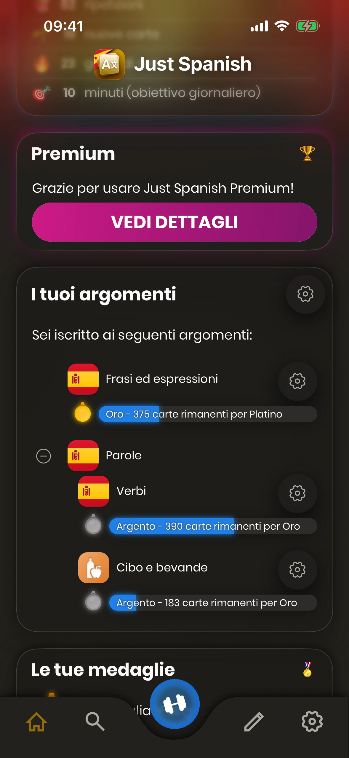 - Obiettivo di apprendimento quotidiano: Qui puoi visualizzare e modificare il tuo obiettivo di apprendimento quotidiano. Tocca la matita per modificare l'obiettivo.