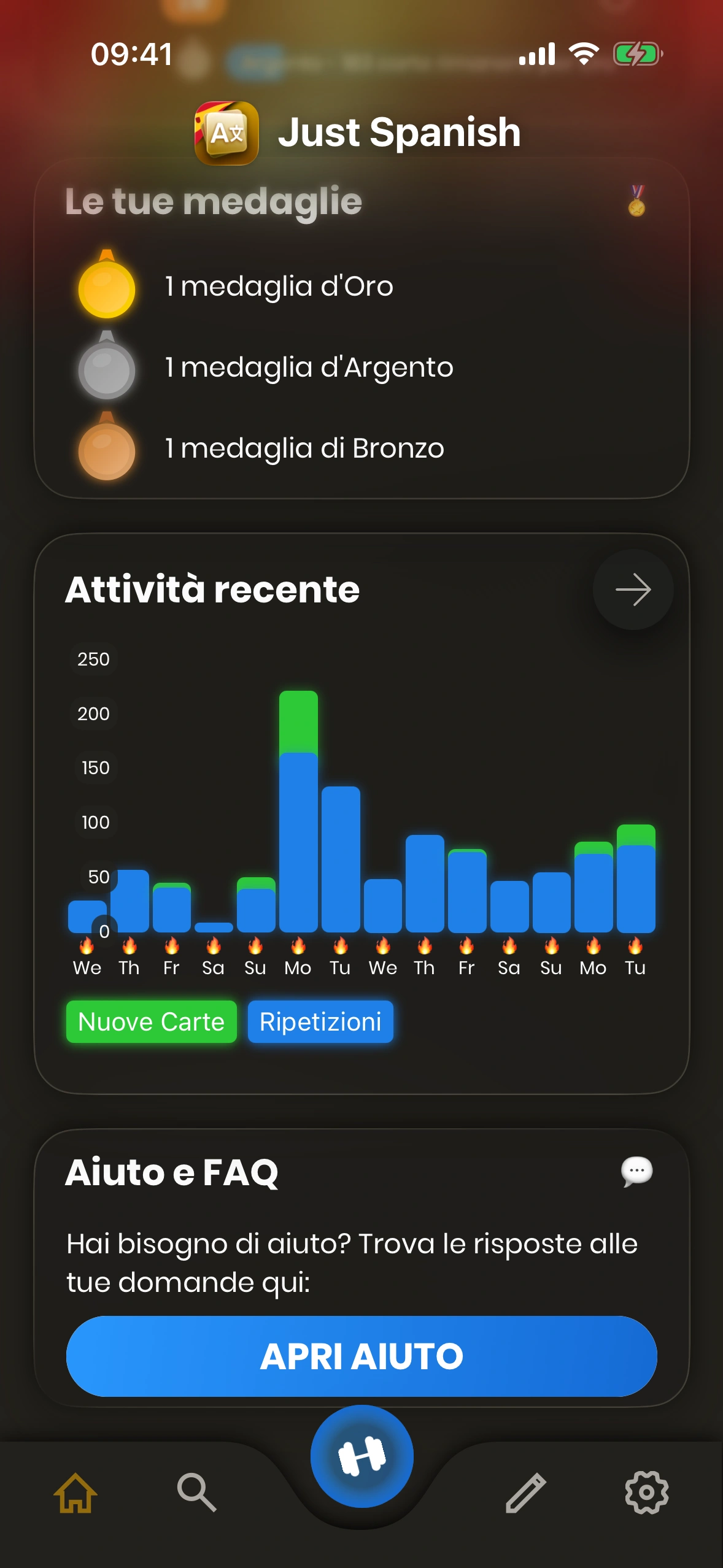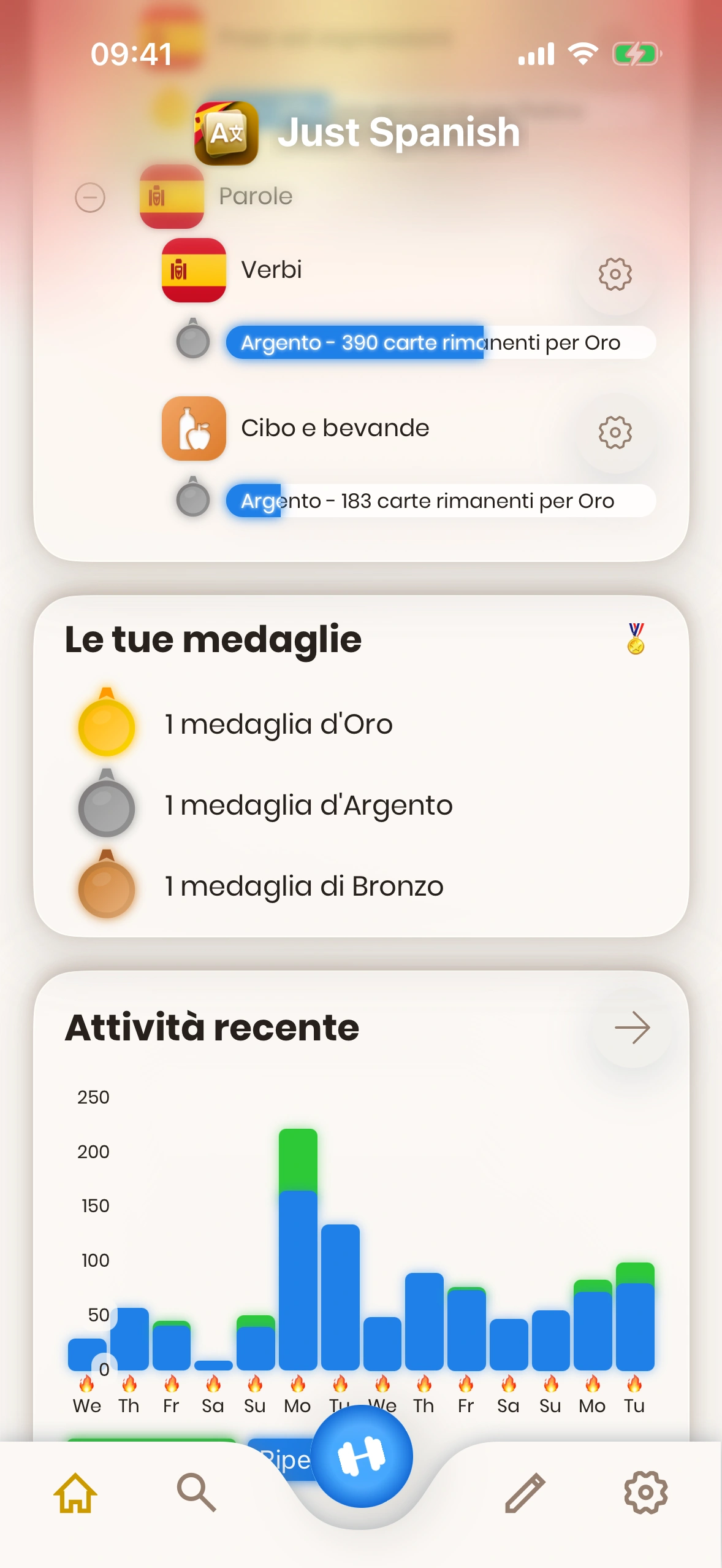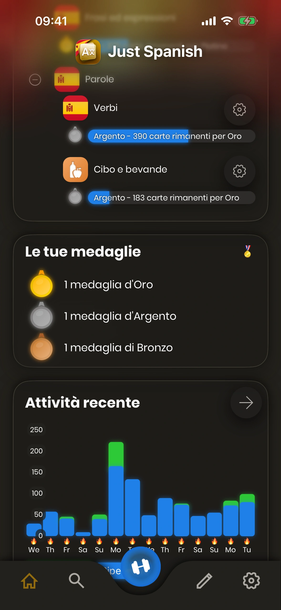 - Attività recente: Qui puoi vedere la tua attività negli ultimi giorni. Le ripetizioni sono mostrate in blu, mentre le nuove carte sono verdi. I giorni con il simbolo 🔥 sono i giorni in cui hai raggiunto il tuo obiettivo quotidiano (giorni della serie). Con il pulsante freccia, puoi anche vedere ulteriori dettagli sulla cronologia delle tue attività.