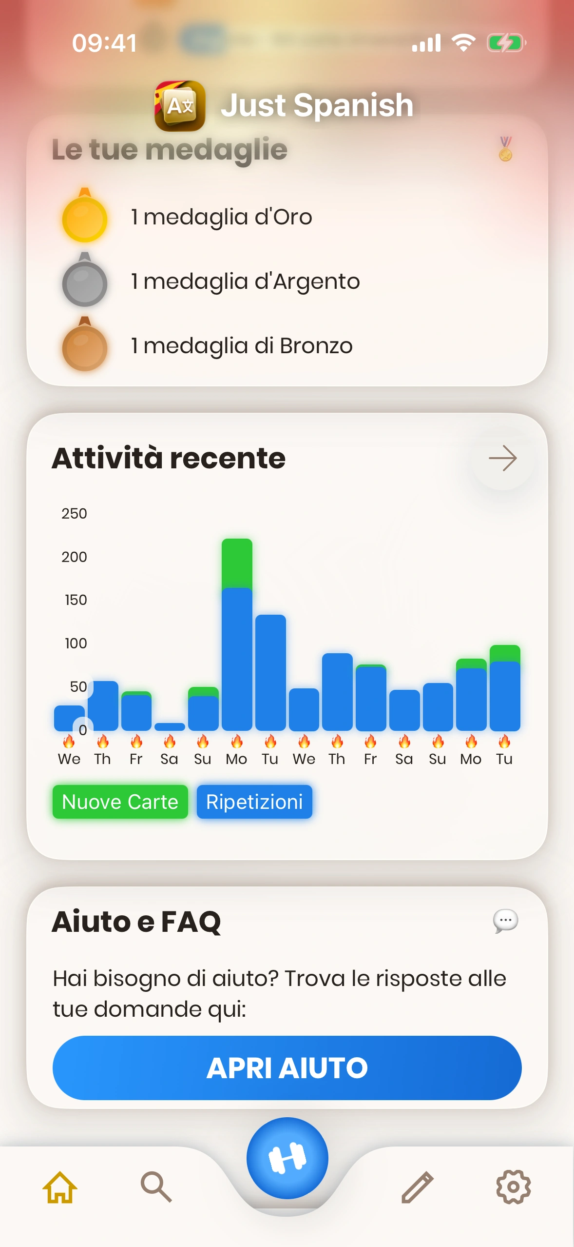 - Le tue statistiche in sintesi: Qui puoi vedere le tue statistiche di apprendimento attuali: il numero di ripetizioni di oggi, il numero di nuove carte di oggi, nonché la tua attuale serie.