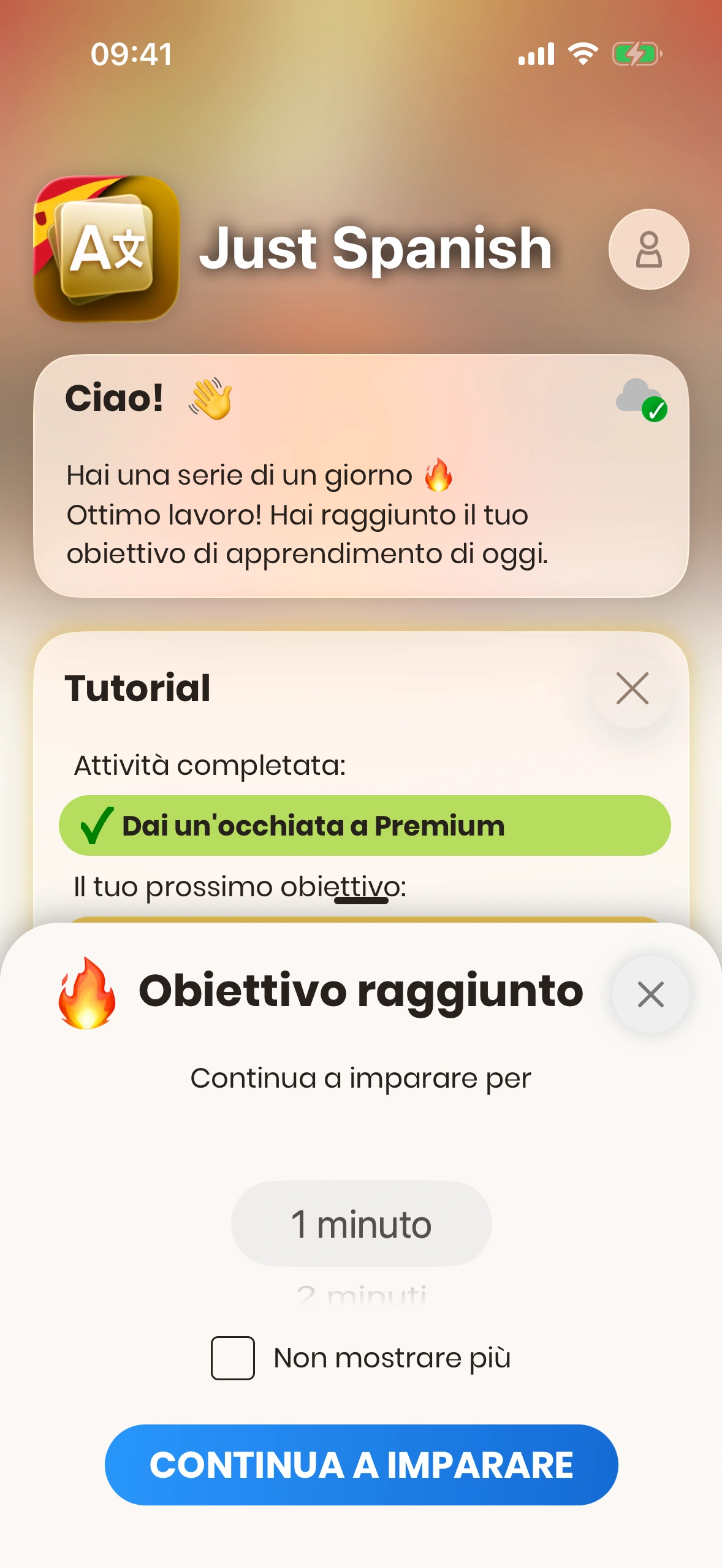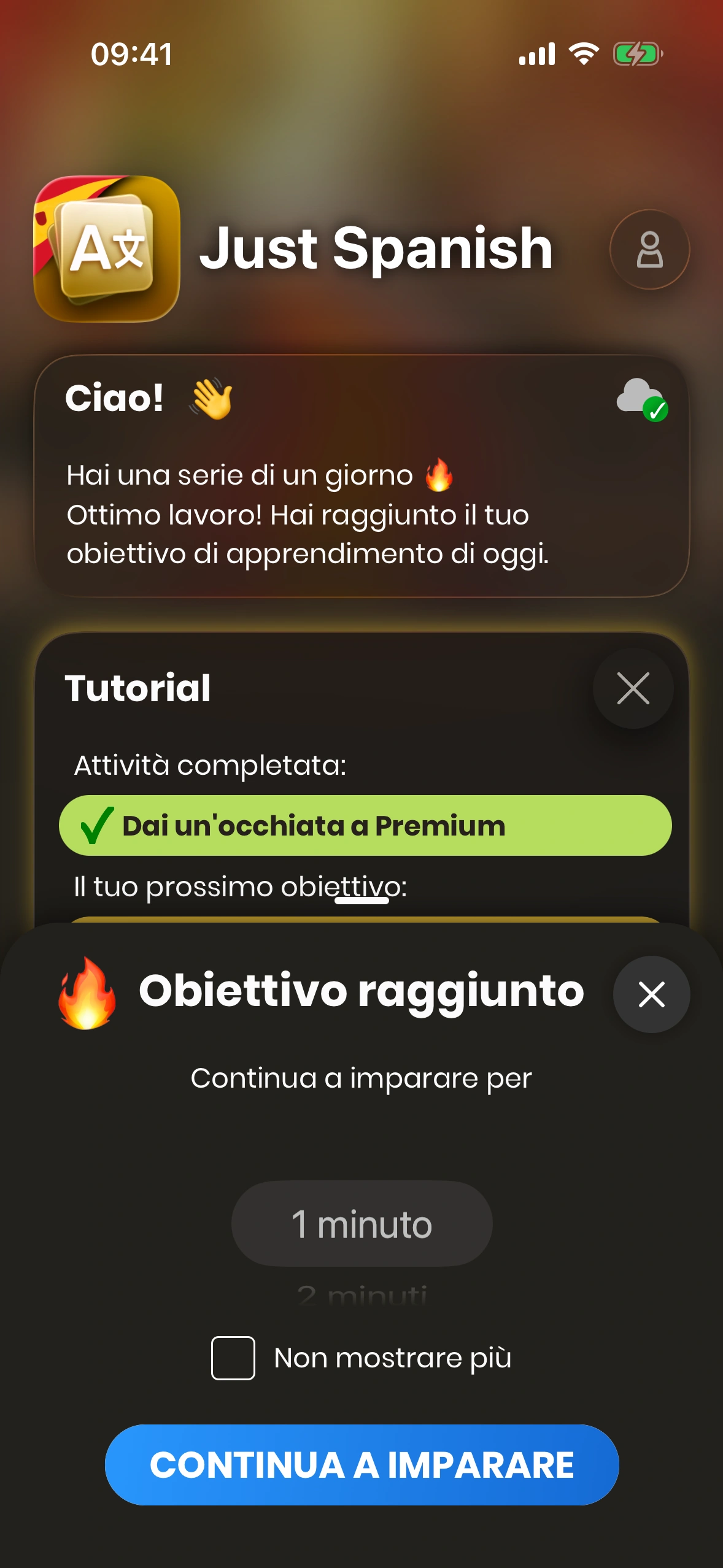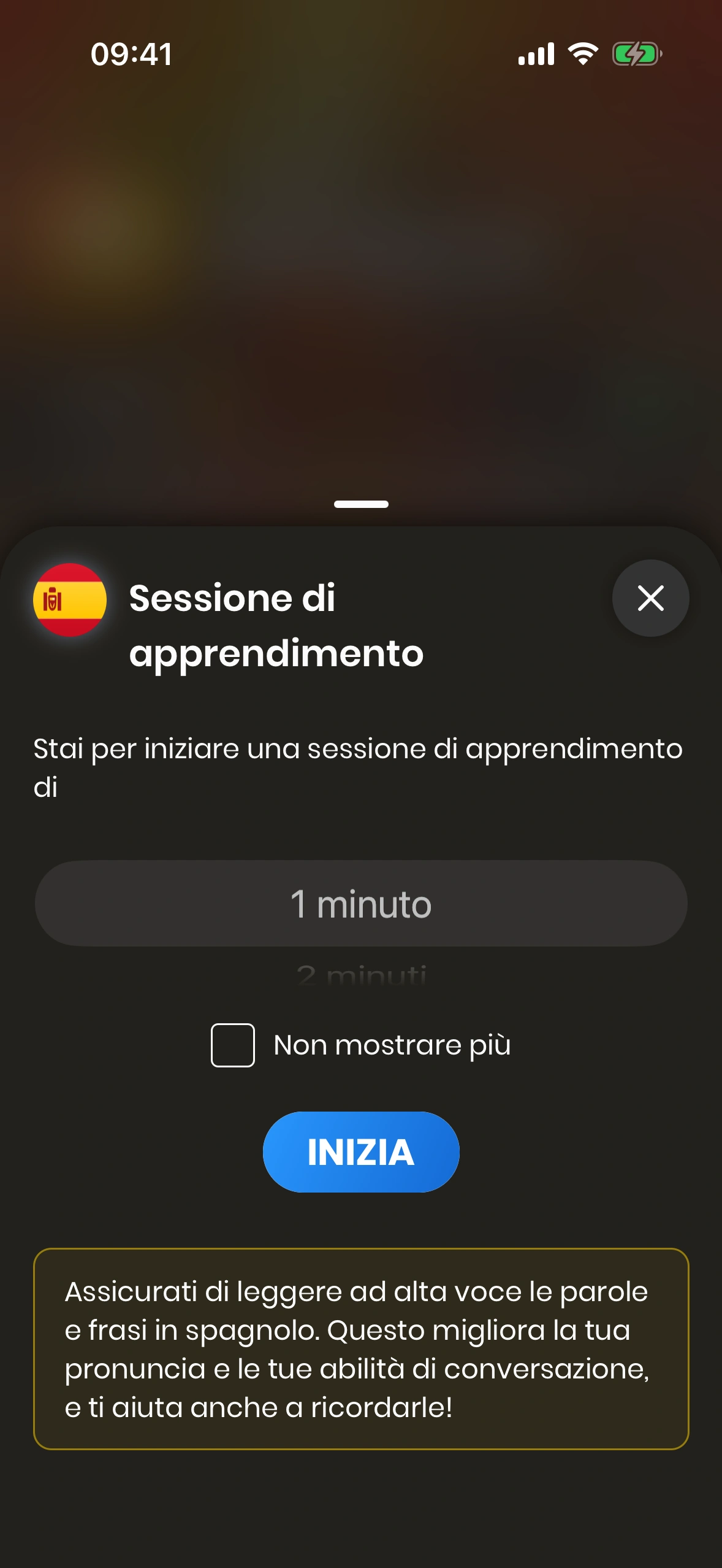 Questo pannello inferiore può essere disabilitato nelle impostazioni. Se disabilitato, la sessione di apprendimento inizierà immediatamente con la durata predefinita.
