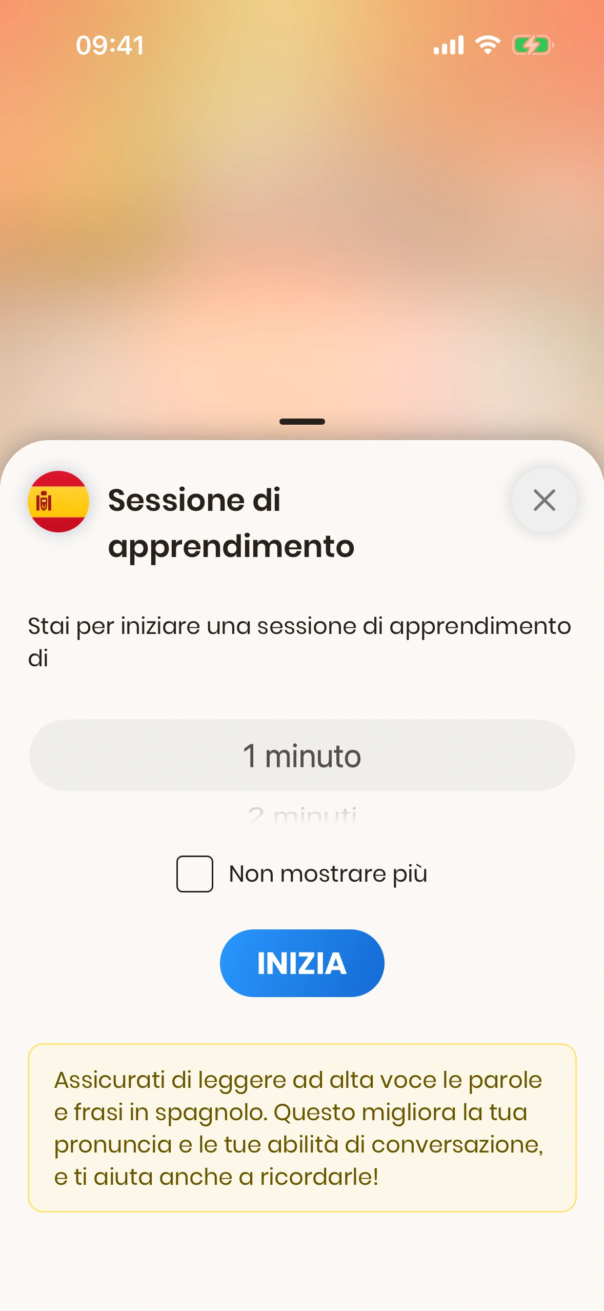 Dopo aver toccato uno di questi pulsanti, verrà mostrato un pannello inferiore che chiede quanto deve durare questa sessione di apprendimento.