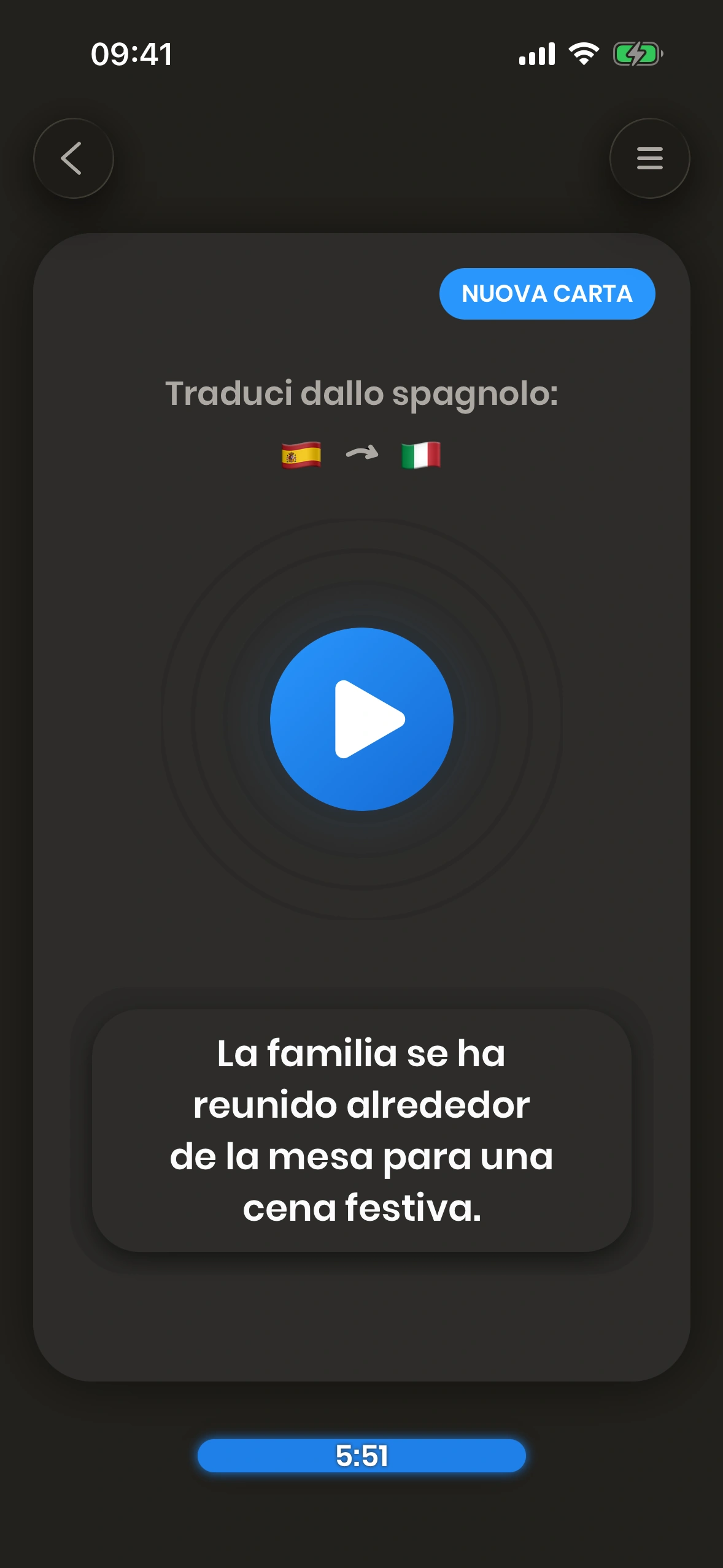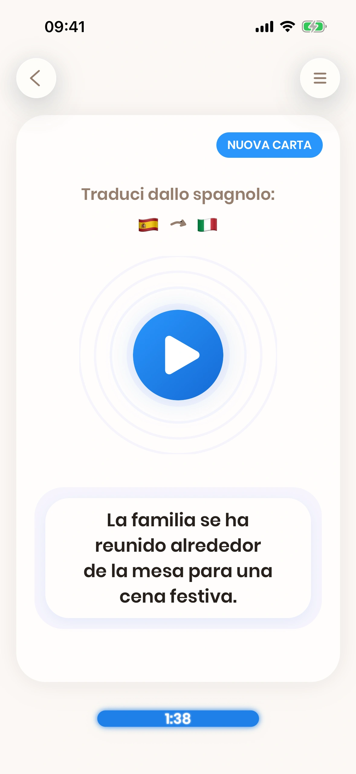 La schermata di apprendimento è dove trascorri la maggior parte del tuo tempo in Just Spanish. Qui tutti i contenuti che impari vengono presentati sotto forma di carte.