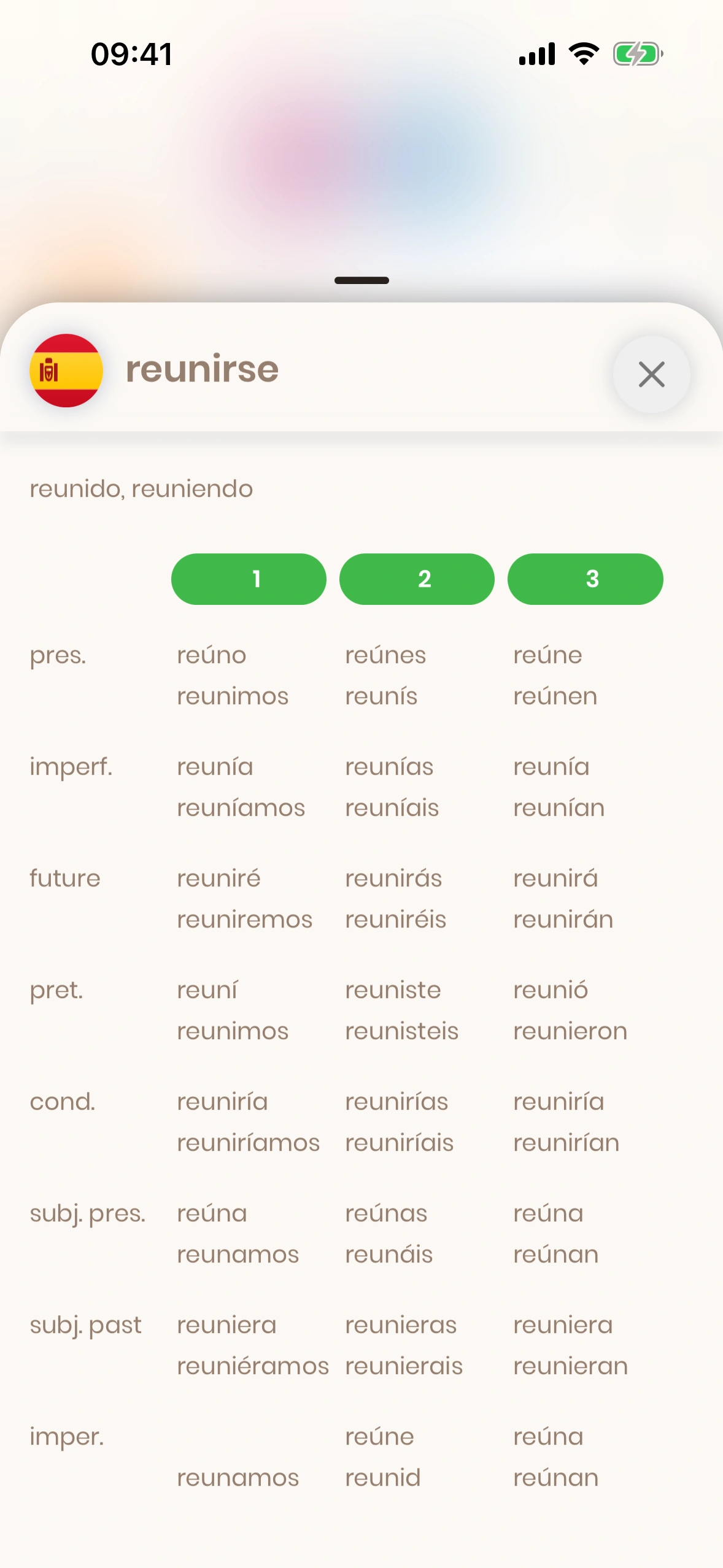 Il modale di coniugazione mostra una tabella di coniugazione verbale. Può essere visualizzato per tutti i verbi Spagnolo. Tocca il Pulsante Aggiungi di un verbo, quindi tocca "Tabella di coniugazione".