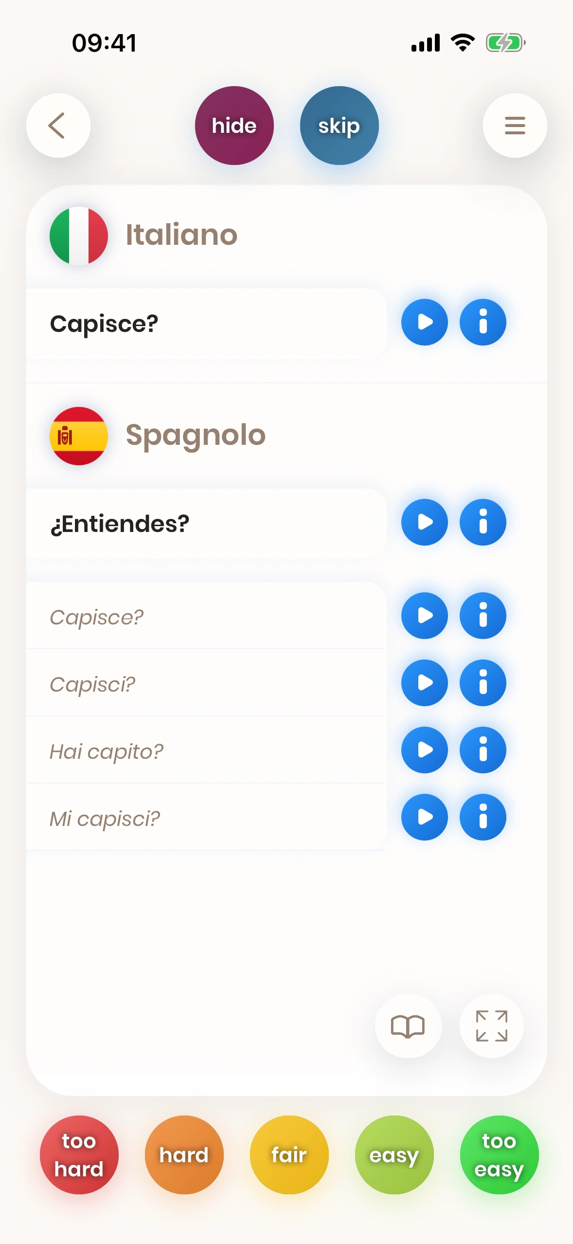 Se tradurre una parola o una frase è difficile per te, devi esercitarti più spesso. Per questo motivo, se premi un tasto rosso come too hard, la carta verrà mostrata di nuovo presto, così puoi esercitarti sulla parola o sulla frase più spesso.