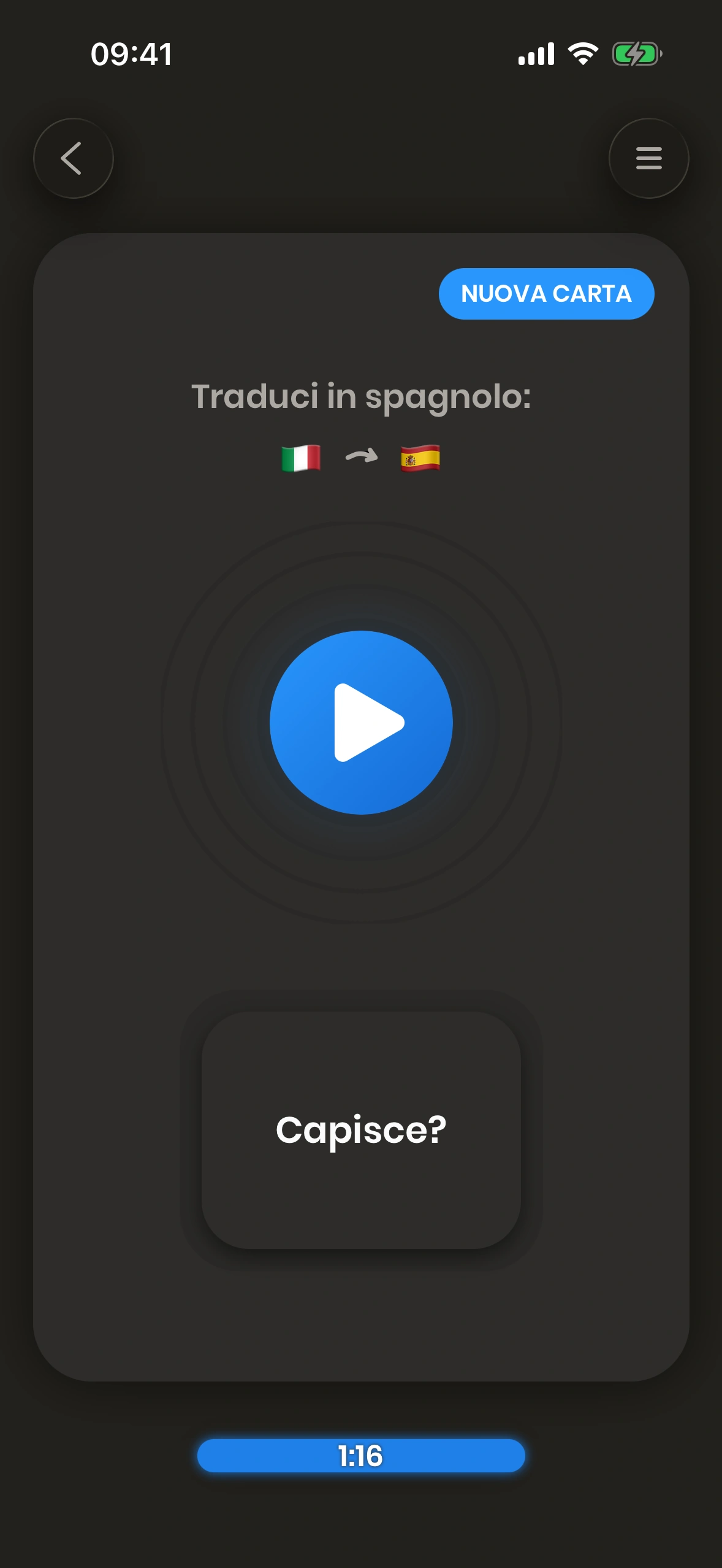 Just Spanish è un'app basata su flashcard. Le flashcard sono carte che hanno sia un fronte che un retro. Guardi il fronte e cerchi di tradurre la parola (o la frase) che vi appare.